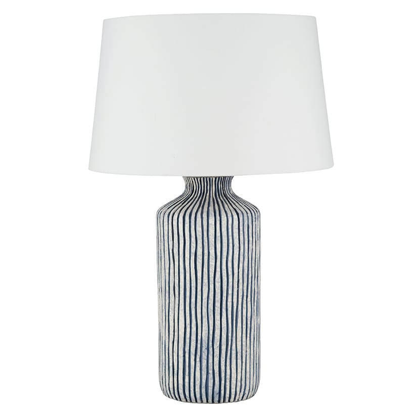 This stoneware lamp base form the Philippines is finished with a hand embossed effect stripe in a contrasting blue on white background. This lamp creates a fresh look to a home by the sea or a room with a coastal effect theme. Shade not included.