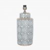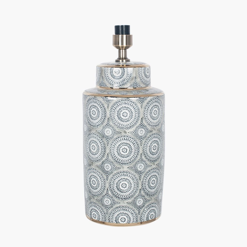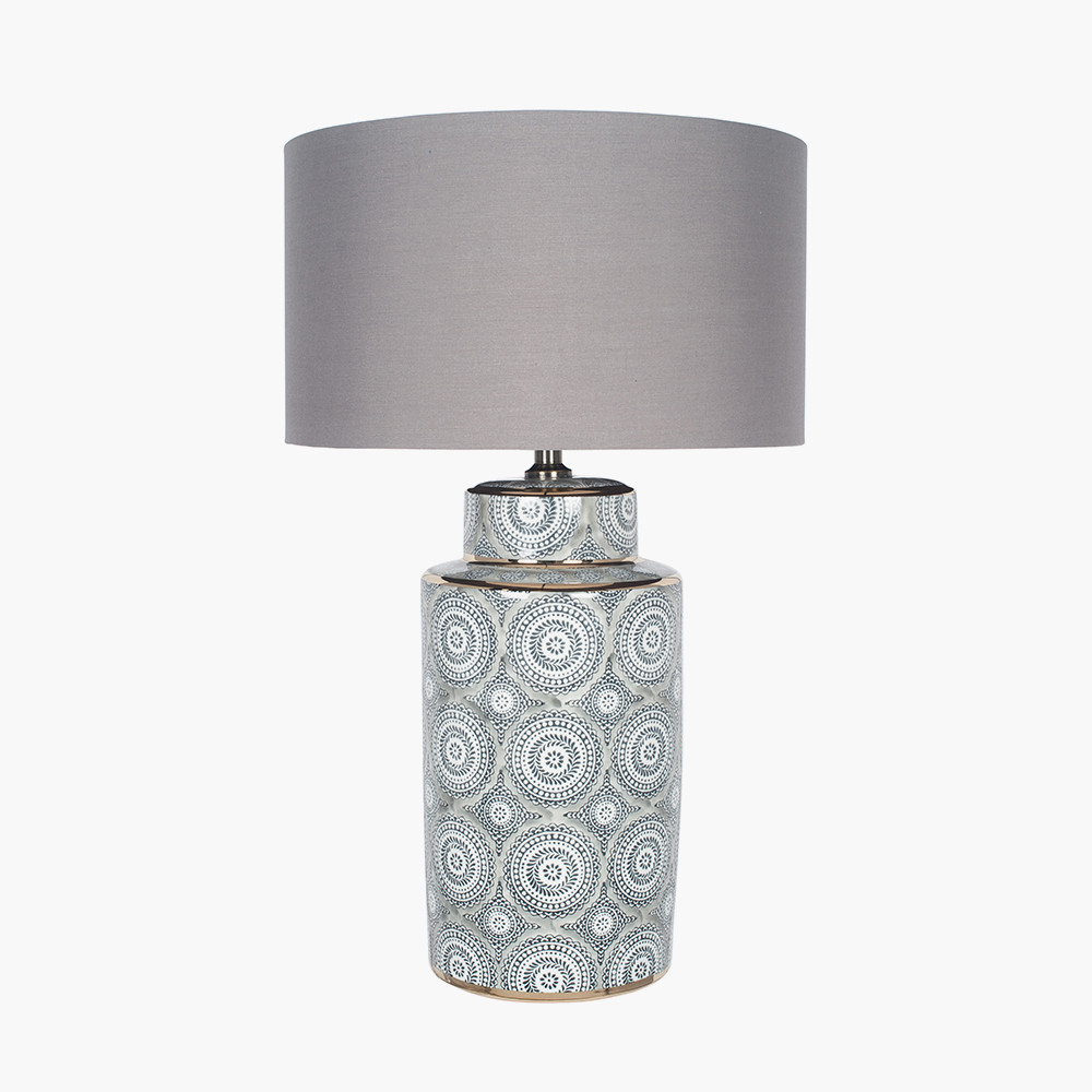 Ceramic lamp with bold geometric grey and white circle pattern finished with a gold detailing.