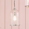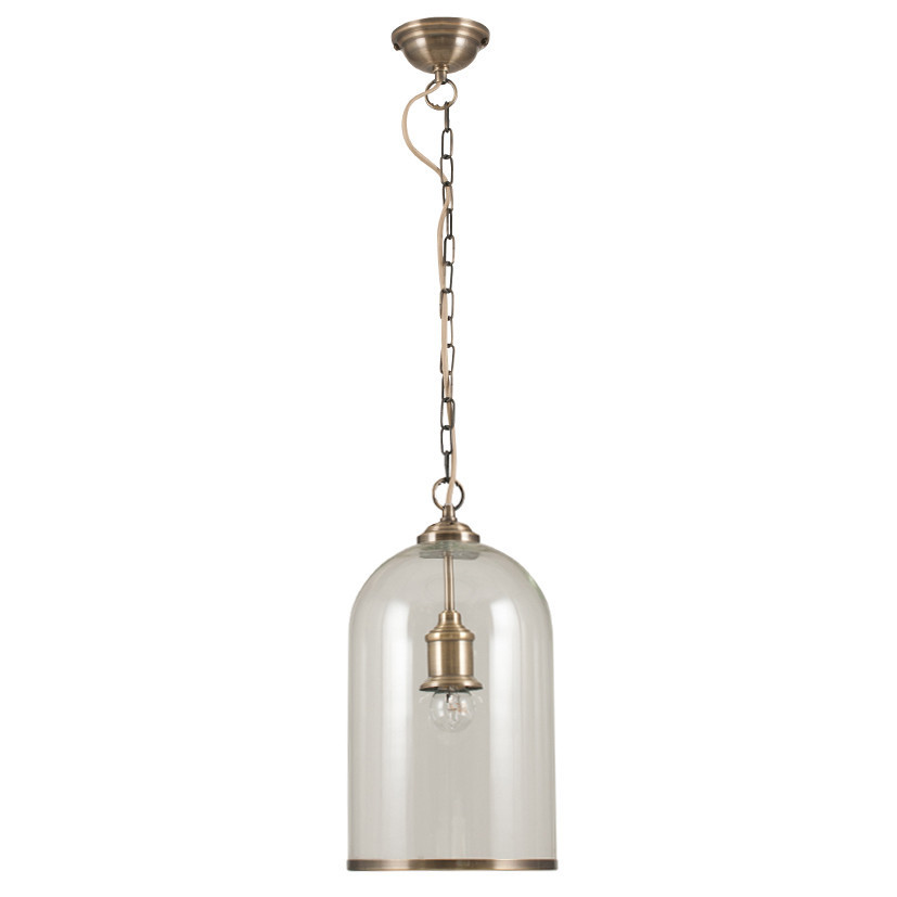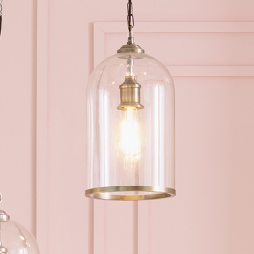 Add some classic charm to your home with this crisp clear glass cloche pendant highlighted with an Antique Brass or Silver metal trim on the bottom and matching ceiling chain.