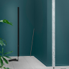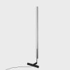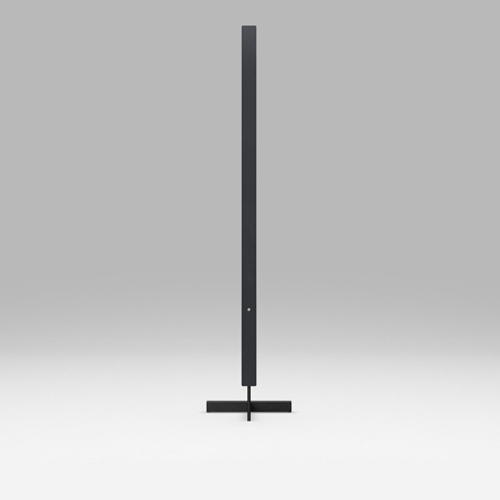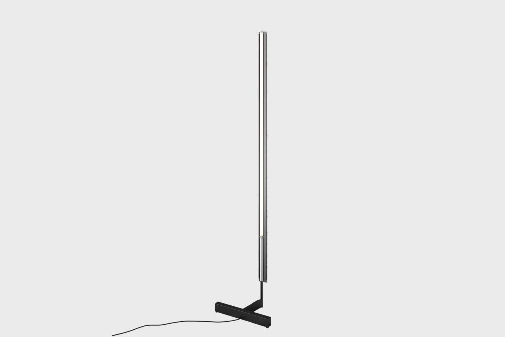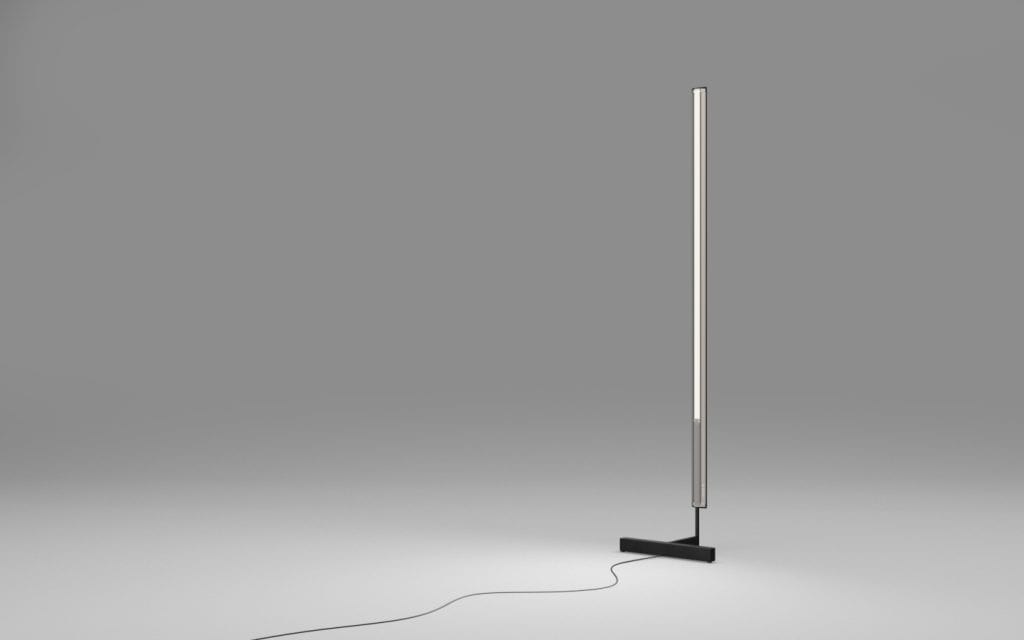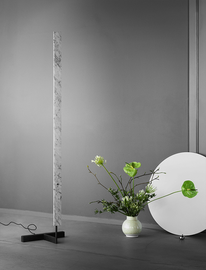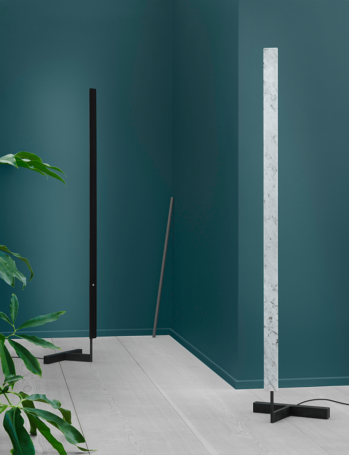 F Model Floor Lamp in Blued Steel or Carrara Marble. This floor lamp showcases a beautiful linear silhouette. Playing with proportions, the lamp presents a narrow base with a tall pivoting light screen.
