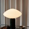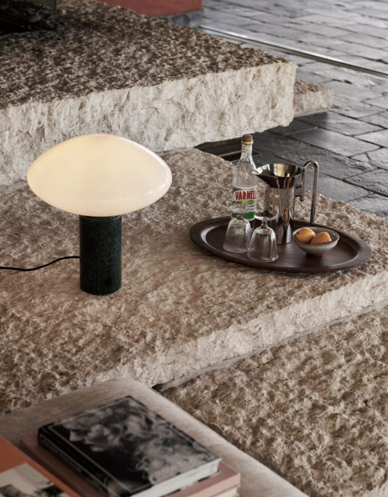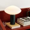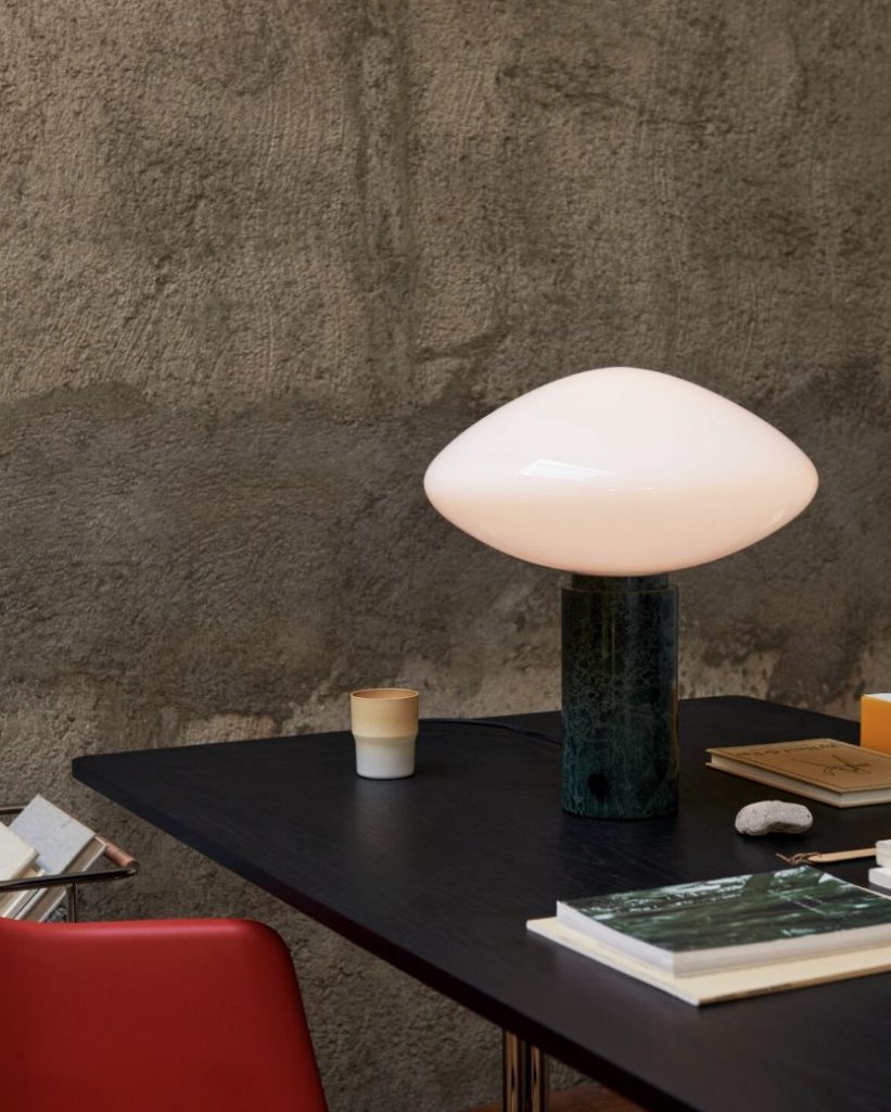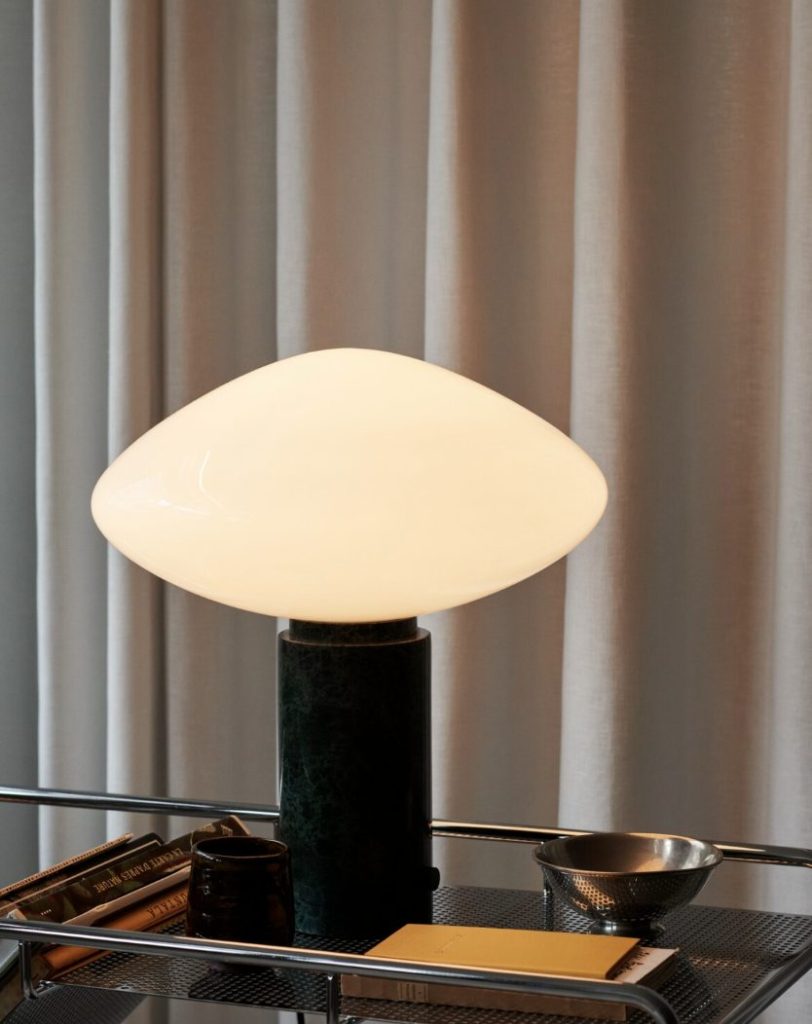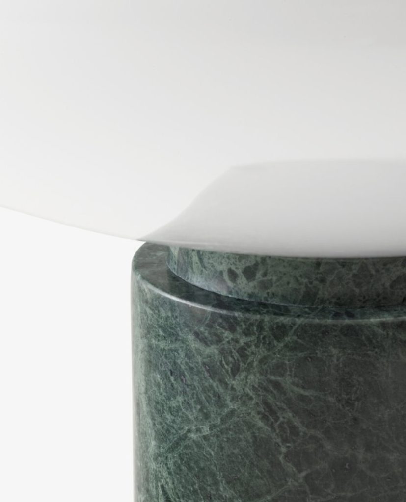 The Mist table lamp, made from mouth-blown opal glass, features a thick marble pillar with a small dimmer switch. The contrast between the light shape of the glass and the solidity of the marble creates a graceful design rich in materiality and character.