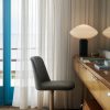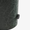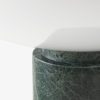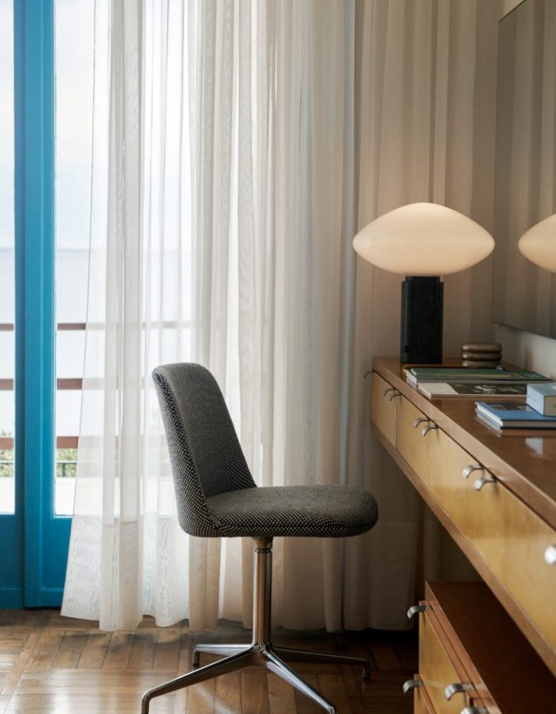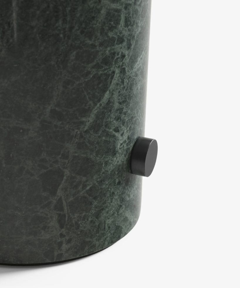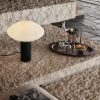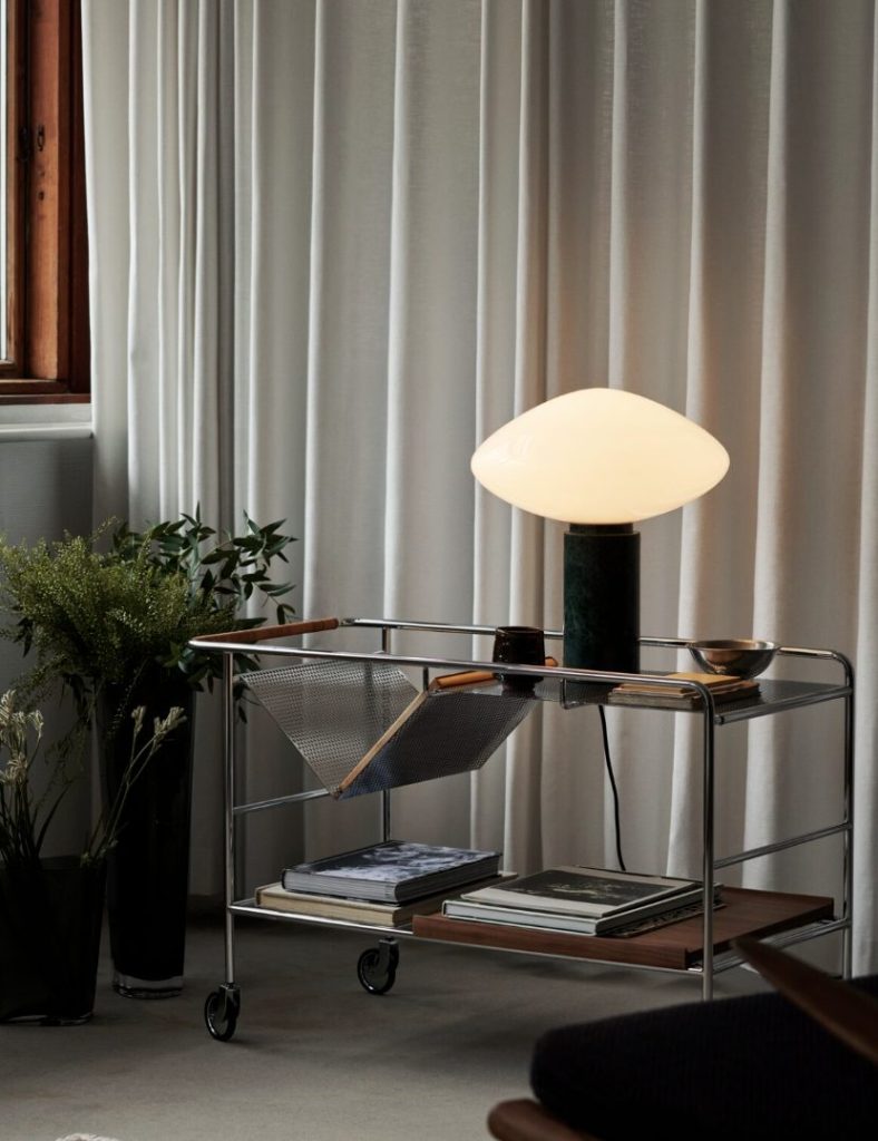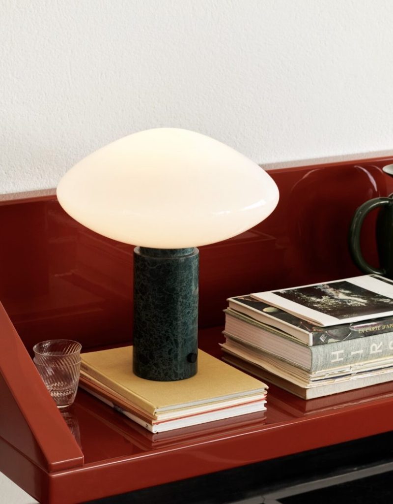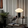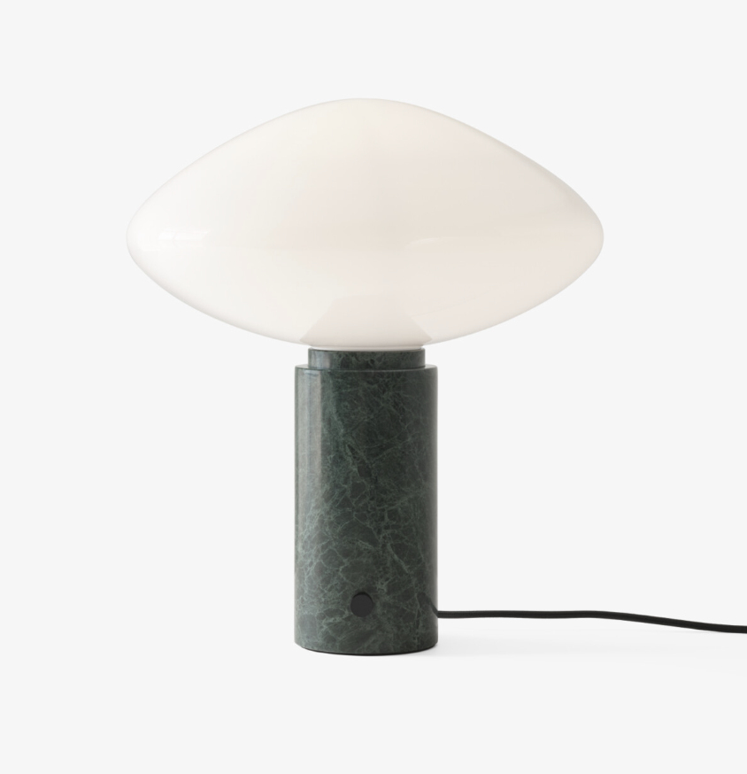The Mist table lamp, made from mouth-blown opal glass, features a thick marble pillar with a small dimmer switch. The contrast between the light shape of the glass and the solidity of the marble creates a graceful design rich in materiality and character.