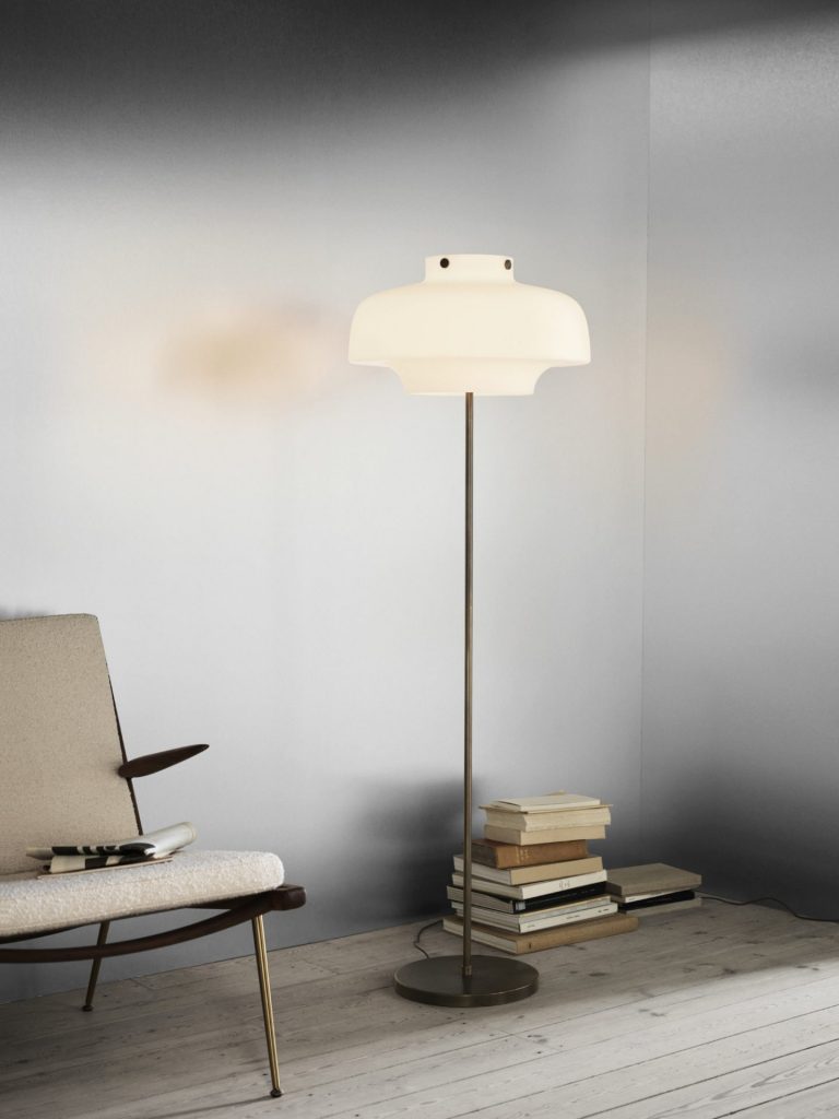 Space Copenhagen’s ambition was to design a lamp with a simple industrial feel, but which was still elegant and poetic. The lamp shade is made from mouth blown opal glass and the base and stem are made from deep drawn and extruded metal.