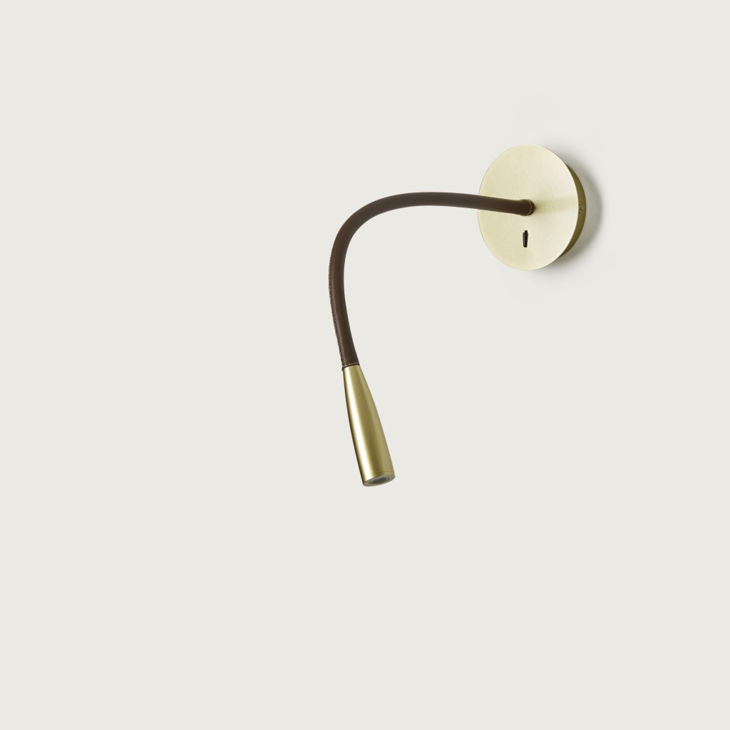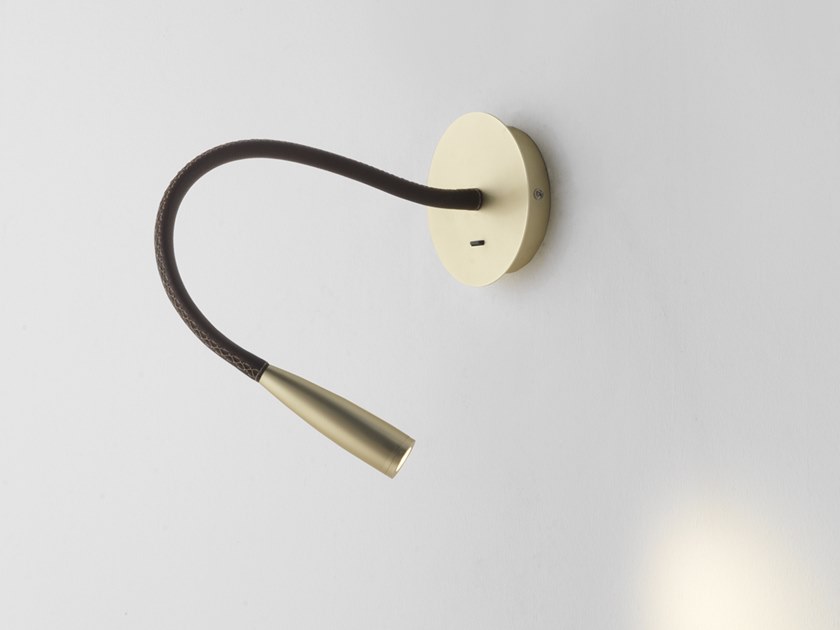 Flexi is a leather and metal LED wall lamp with flexible arm.