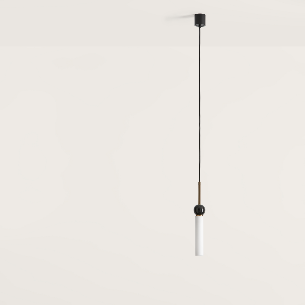 Delie pendant in Matt Black with White Marble or Old Gold with Black Marble. Opal Glass Shade included.
