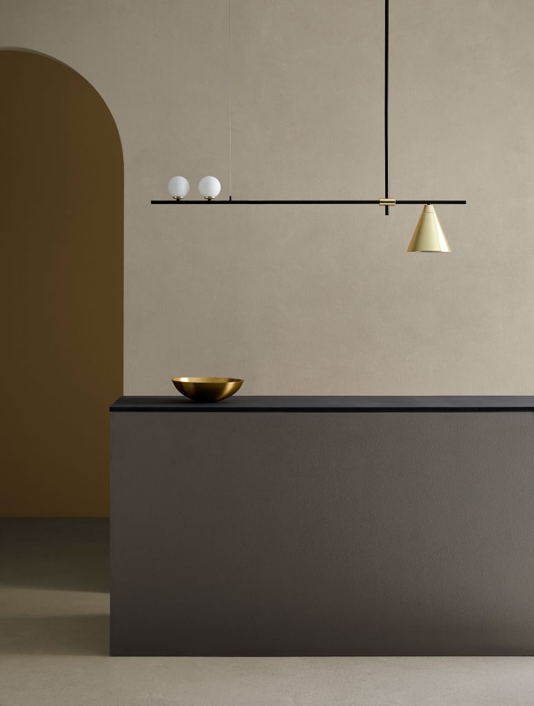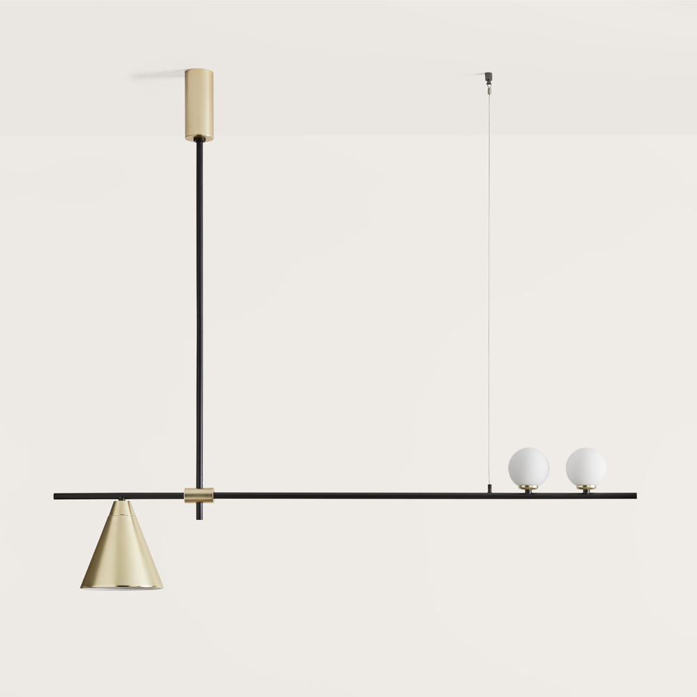 Crane ceiling light in Matt Black with Matt Brass details and Opal Glass Shades.