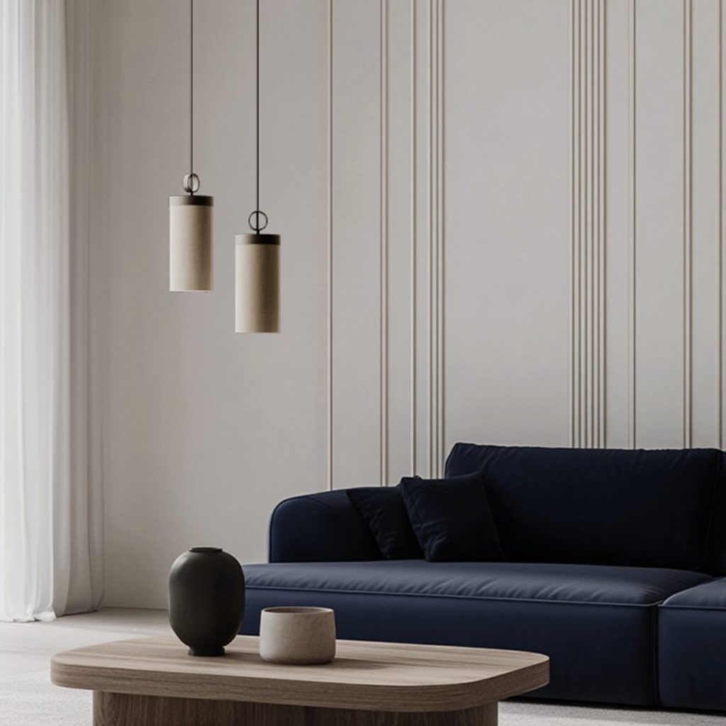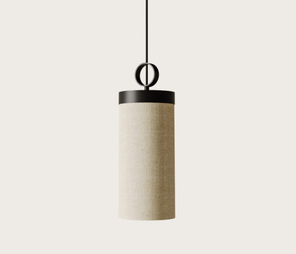Nooi Pendant in Matt Black with Cream Linen Shade.