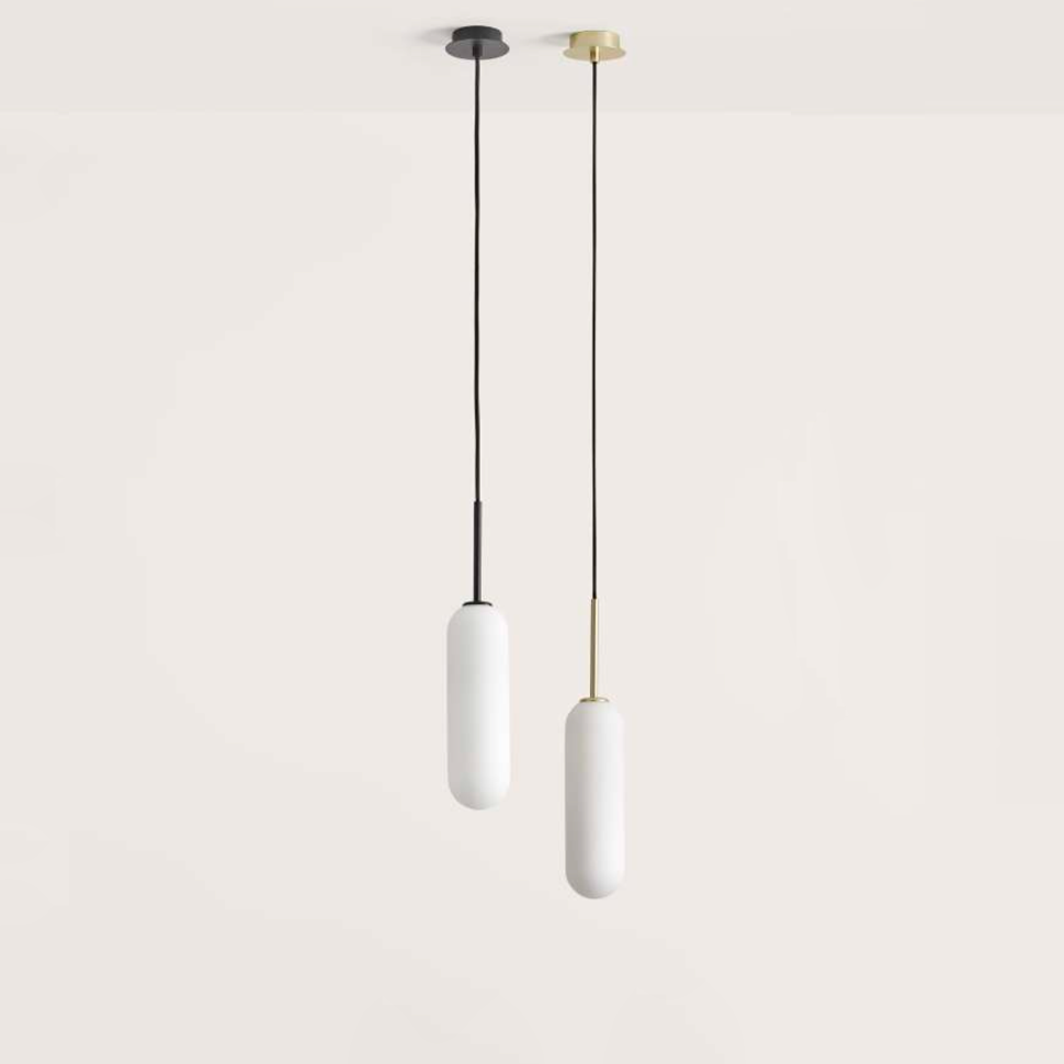 Atil ceiling pendant in Matt Black or Matt Brass with Opal Glass Shade.