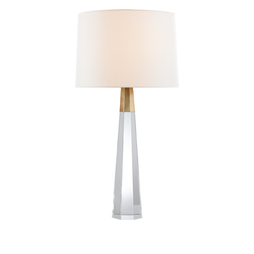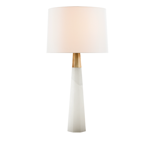 Olsen Table Lamp in Hand-Rubbed Antique Brass with Linen Shade. Alabaster or Crystal base available.