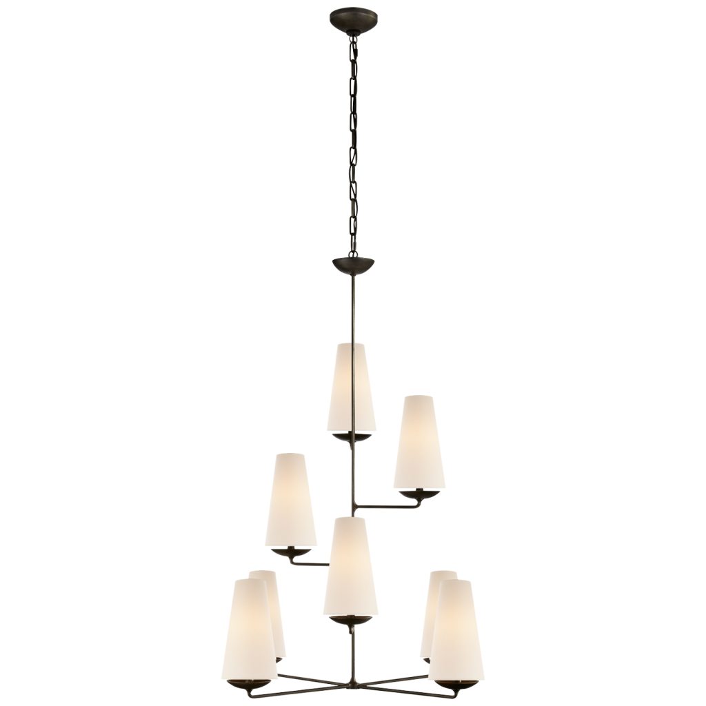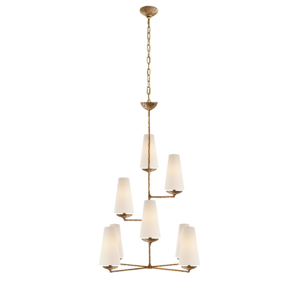 Fontaine Vertical Chandelier in Aged Iron or Gilded Plaster with Linen Shades.
