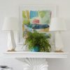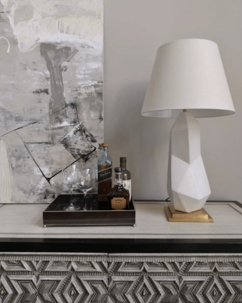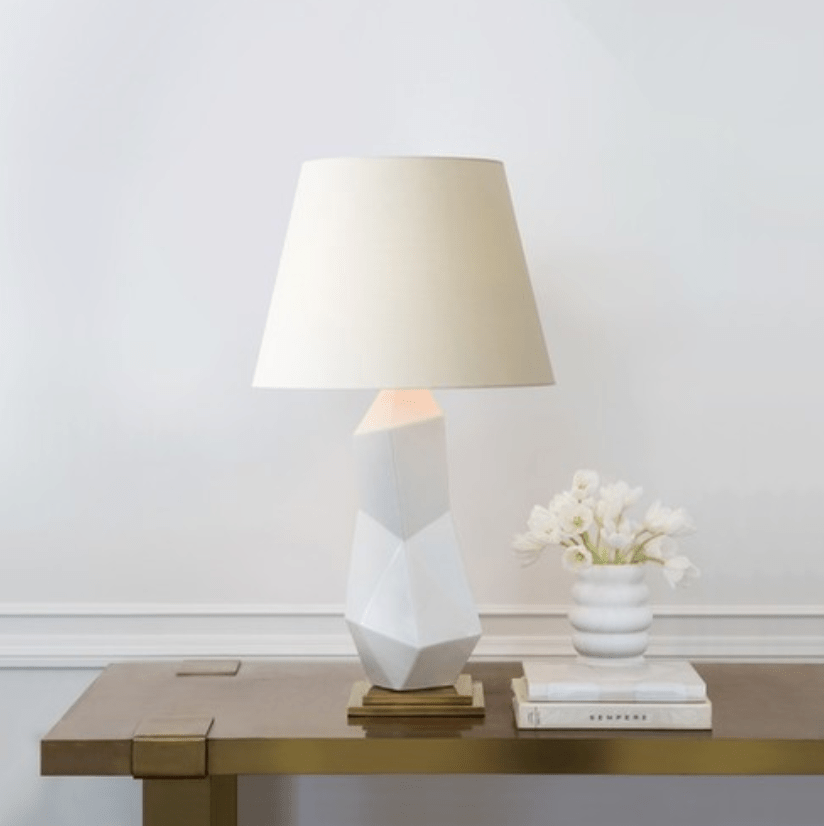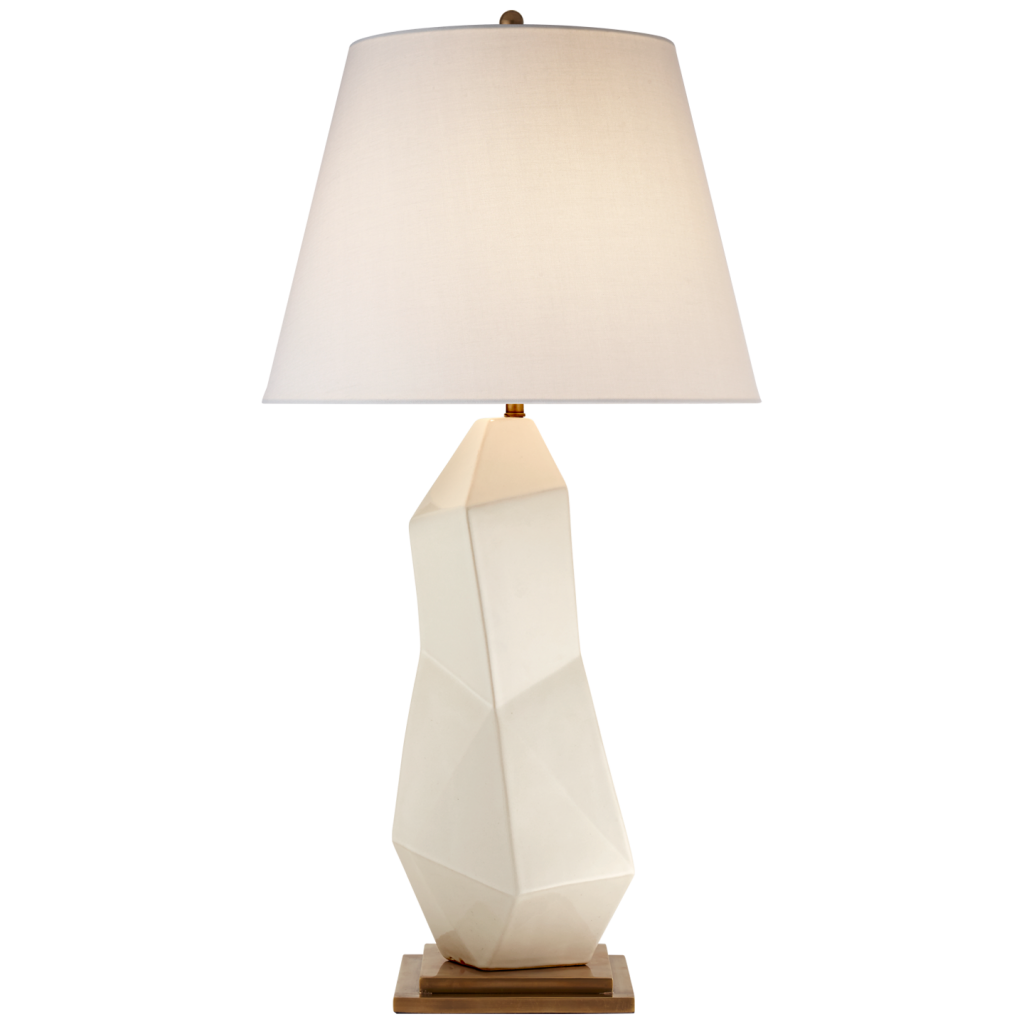 Bayliss Table Lamp in White Leather Ceramic with Linen Shade.