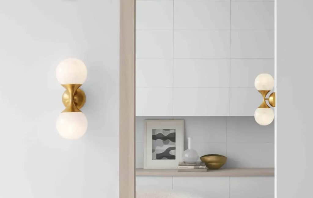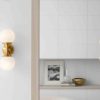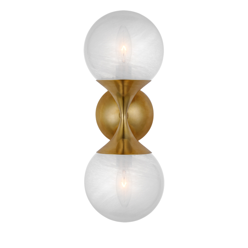 Cristol Small Double Sconce in Hand-Rubbed Antique Brass with White Glass.