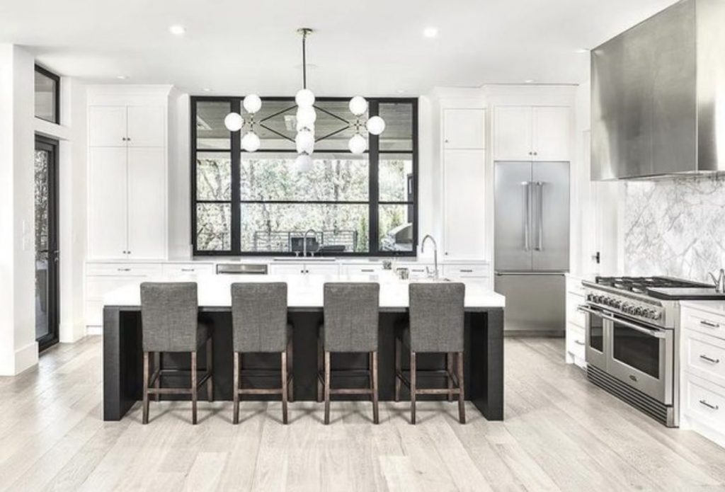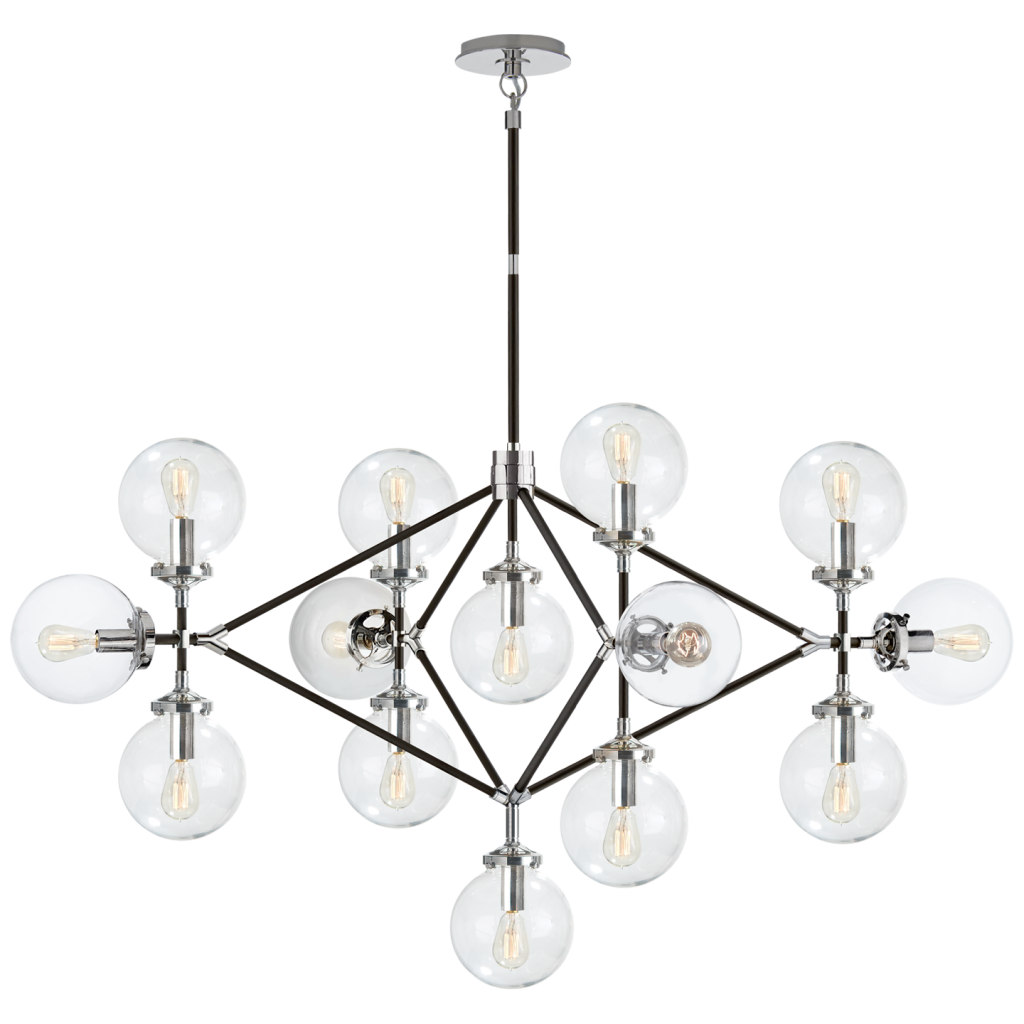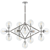 Bistro Four Arm Chandelier in Polished Nickel and Black with Clear Glass.