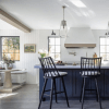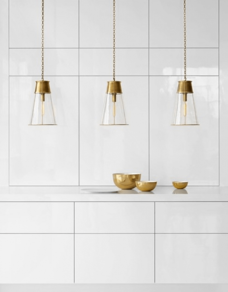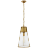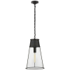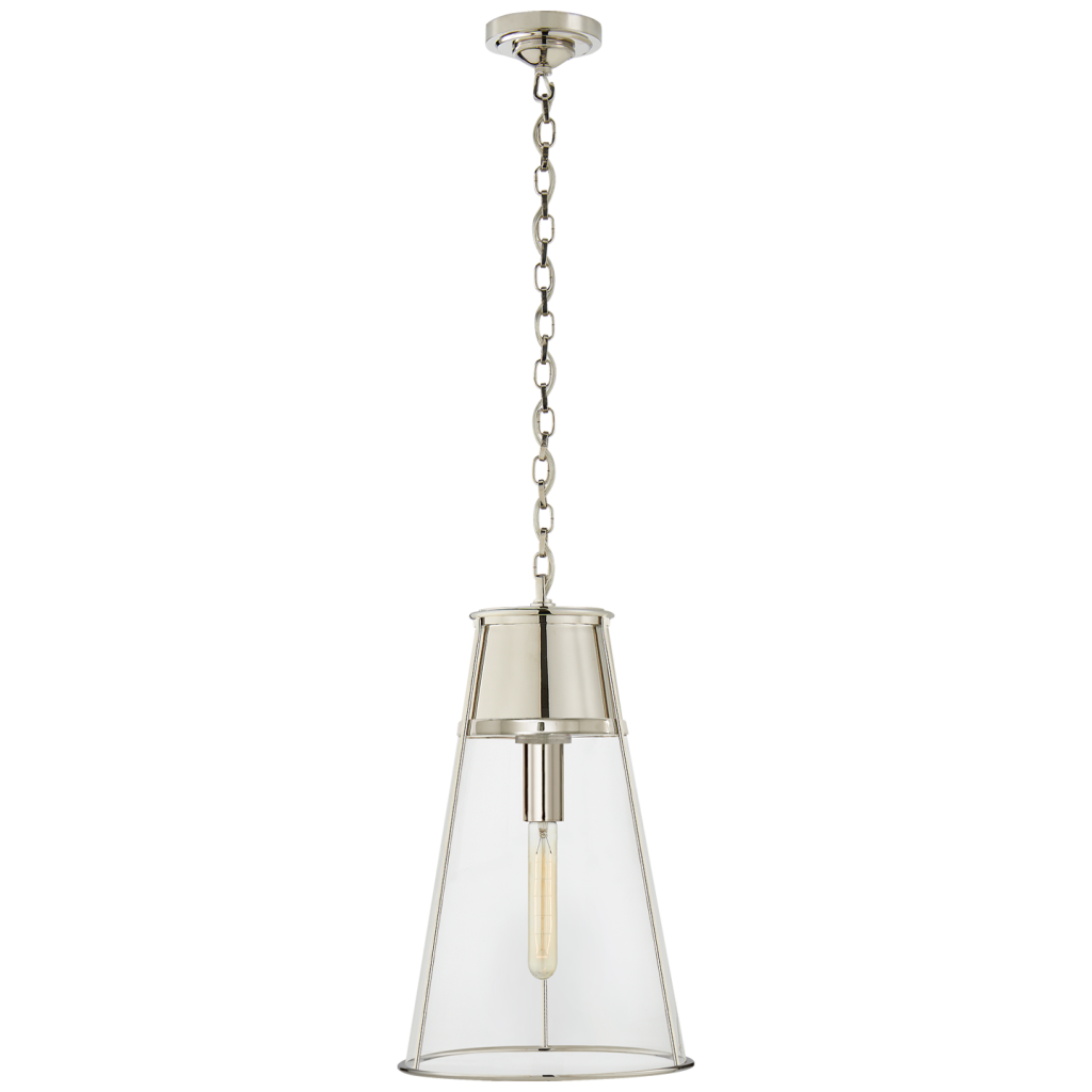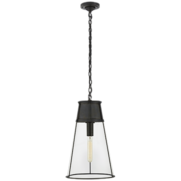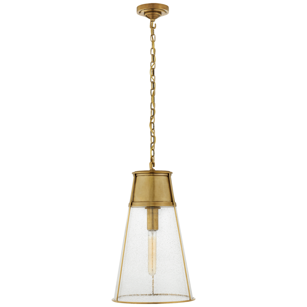 Robinson Large Pendant. Available in Hand-Rubbed Antique Brass with Seeded or Clear Glass, Bronze with Clear Glass, or Polished Nickel with Clear Glass or White Glass.