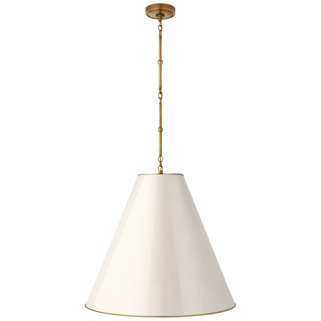 Large Goodman Hanging Light in Hand-Rubbed Antique Brass with Antique White Shade.