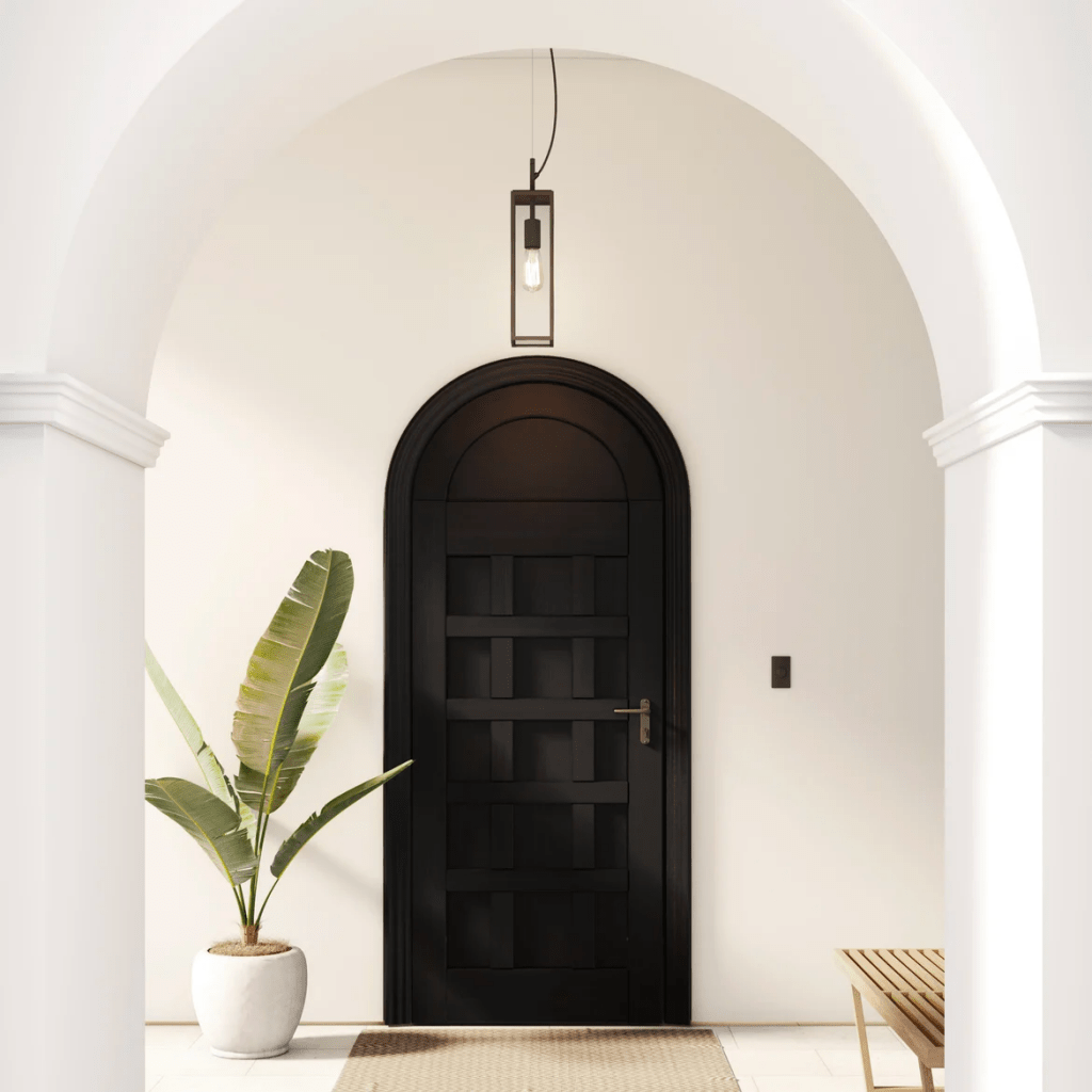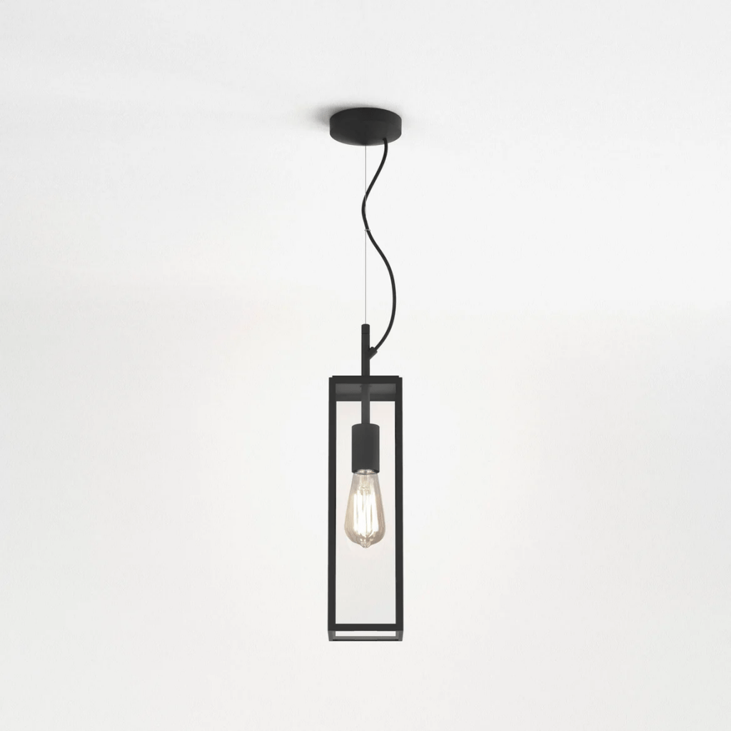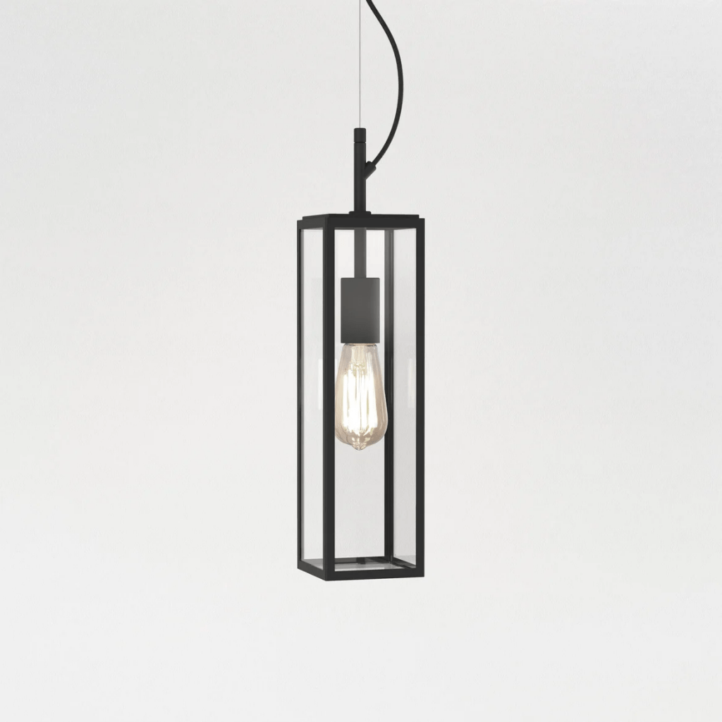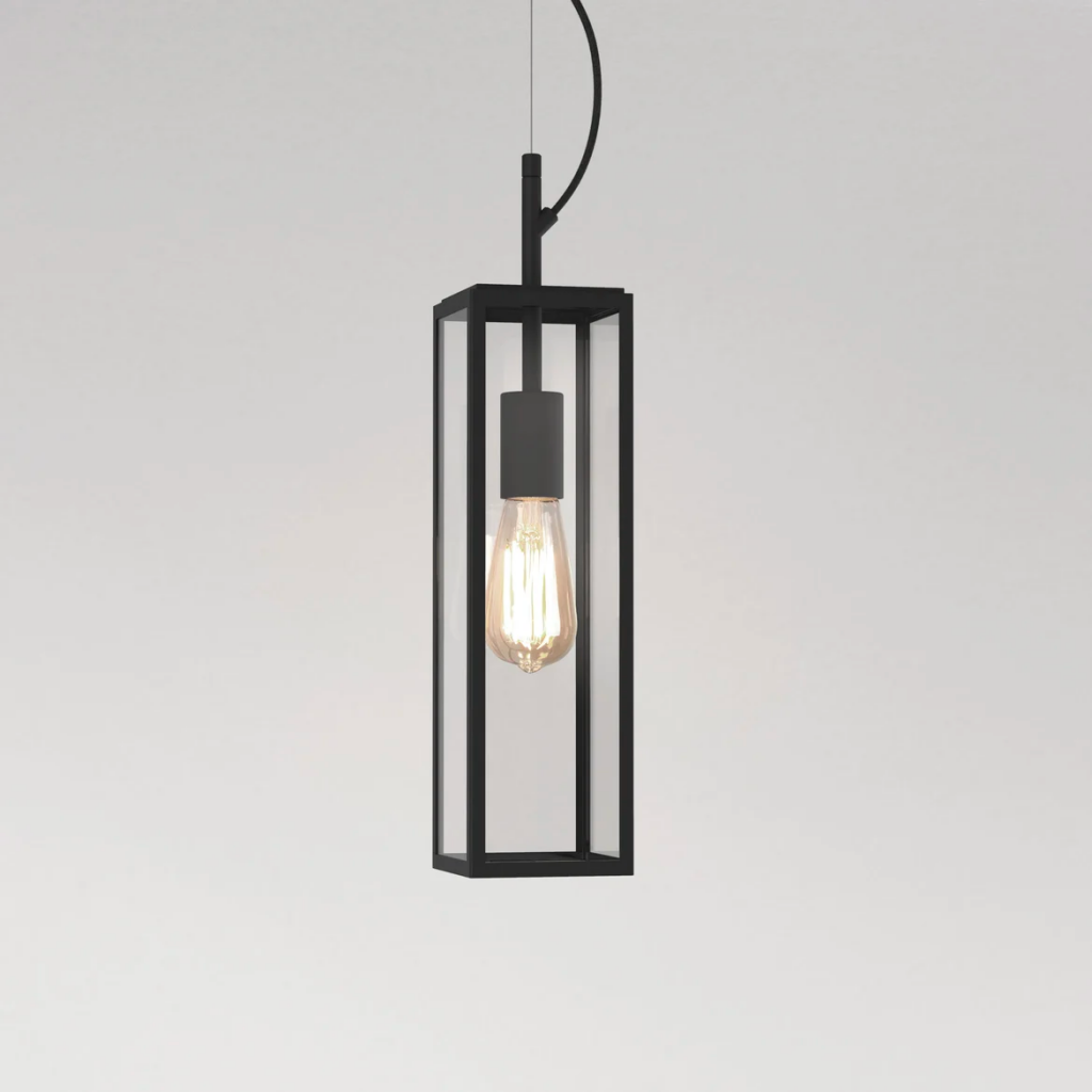 A modern interpretation of the traditional lantern in a slimline box shape, the Harvard Pendant outdoor light brings a crisp elegance to an exterior porch, complementing any style of architecture. It has an all-weather IP44 rating and a textured black powder-coated finish for a dramatic look with outdoor-grade protection.