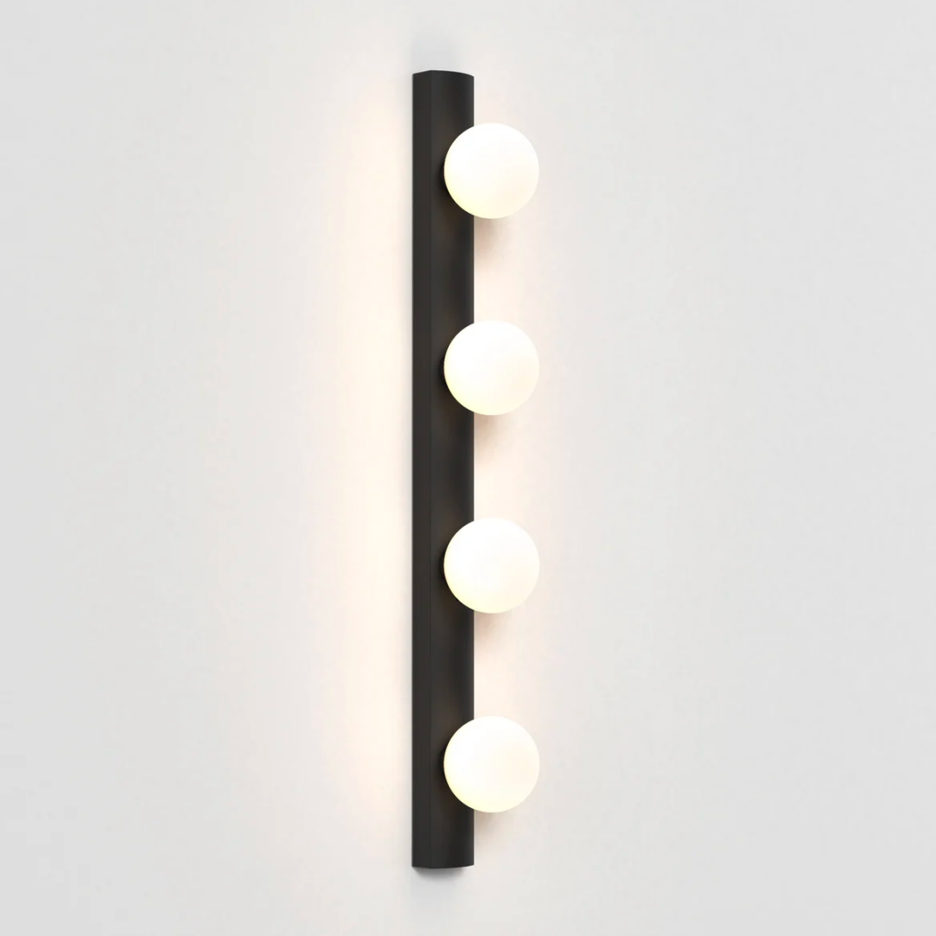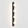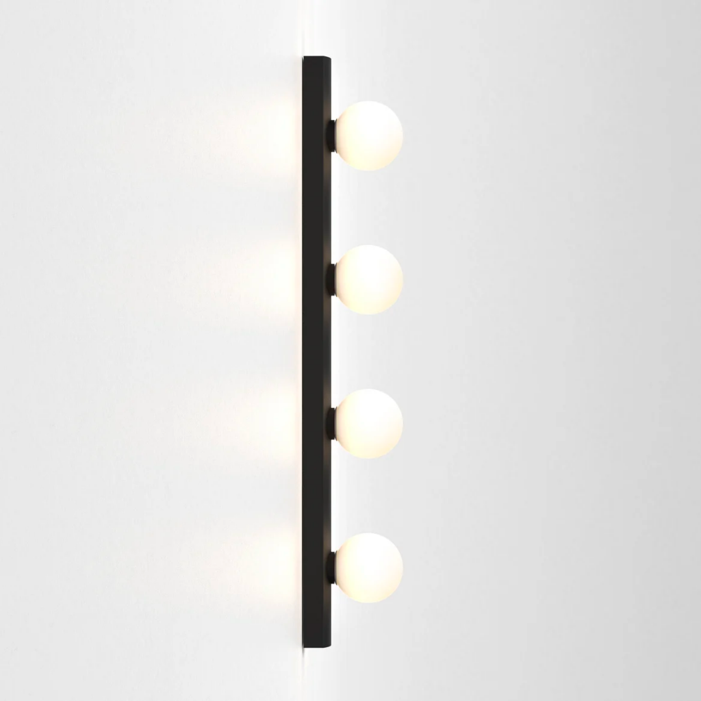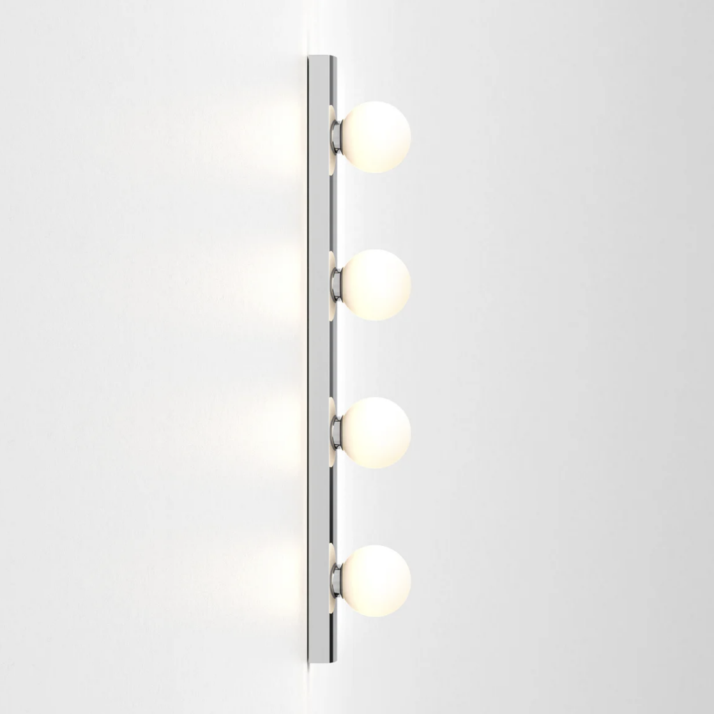 A contemporary take on the classic Hollywood mirror, this wall light features a slender matt black or polished chrome steel body and four blown glass globes for bright, even illumination.