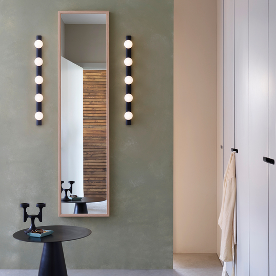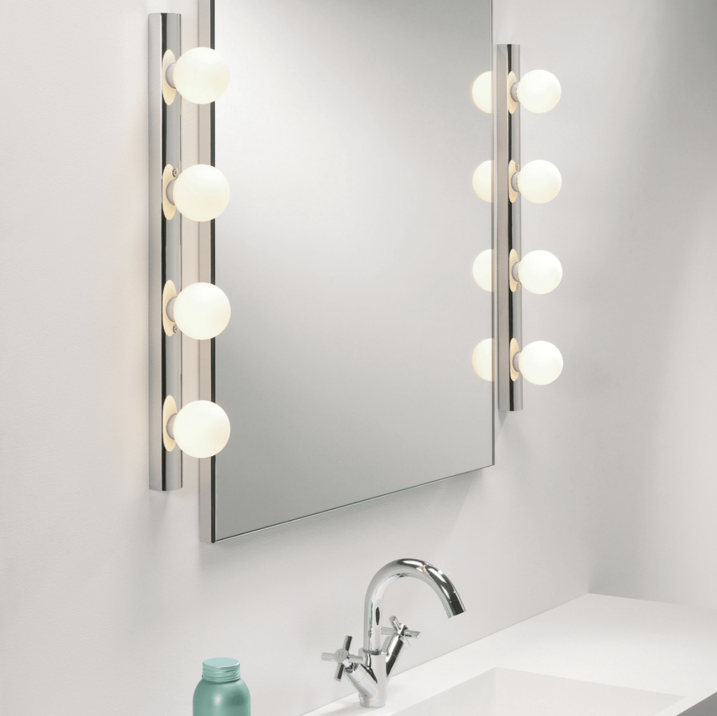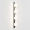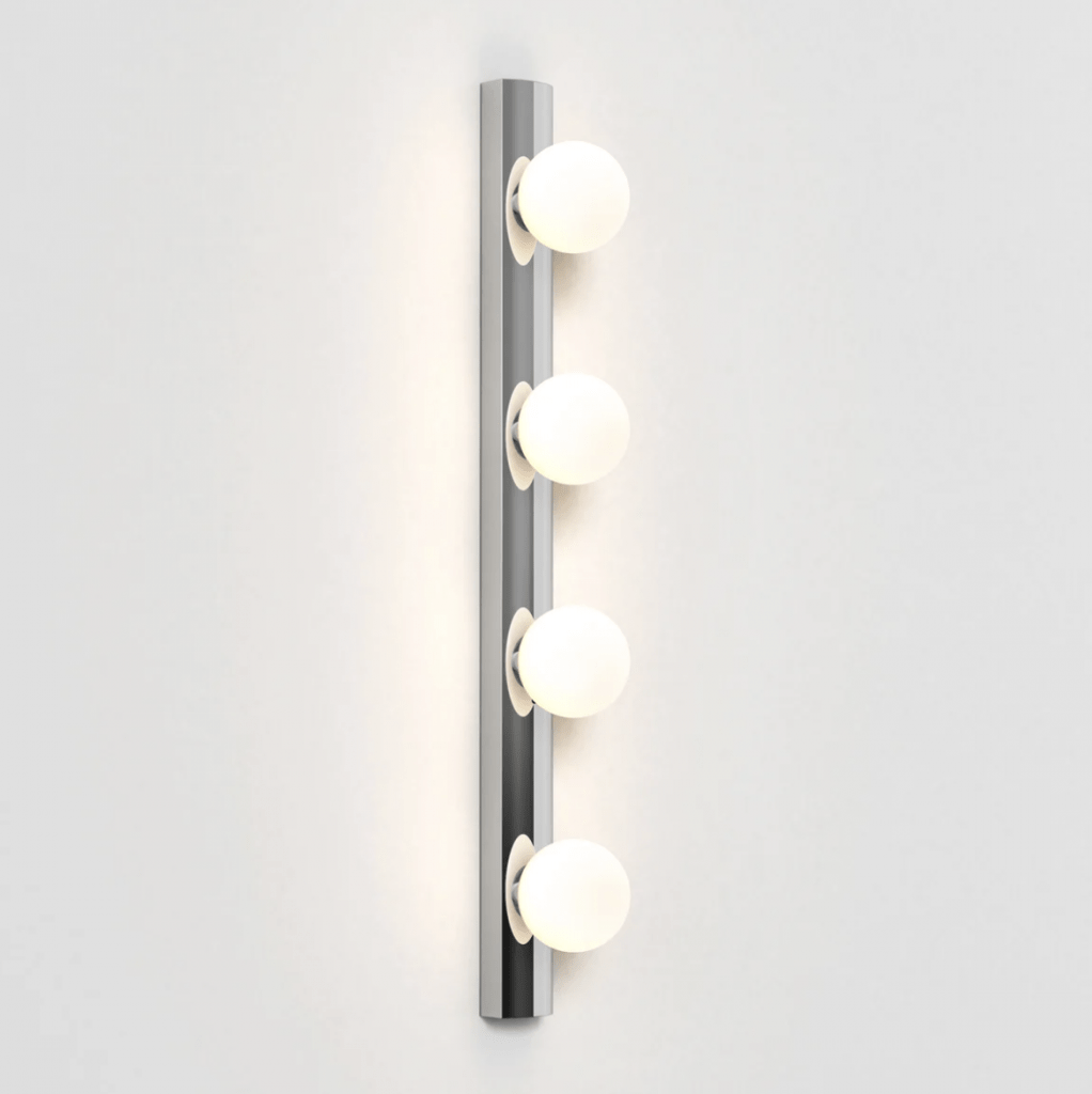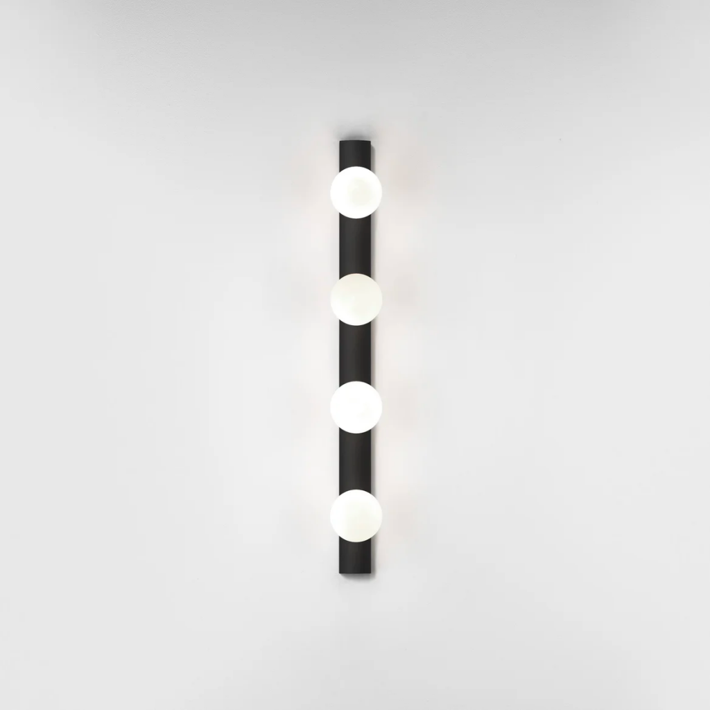 A contemporary take on the classic Hollywood mirror, this wall light features a slender matt black or polished chrome steel body and four blown glass globes for bright, even illumination.