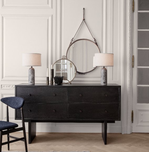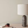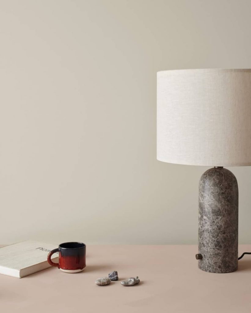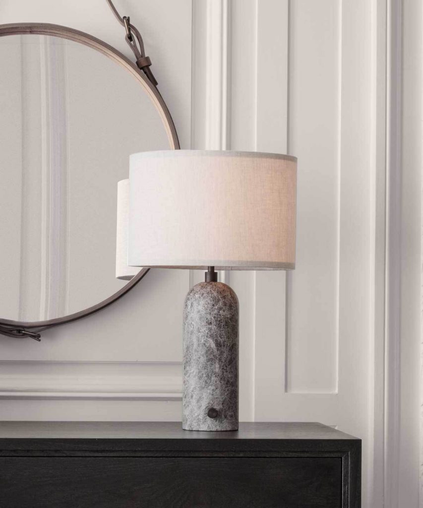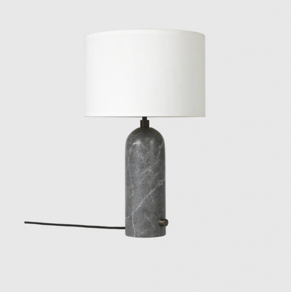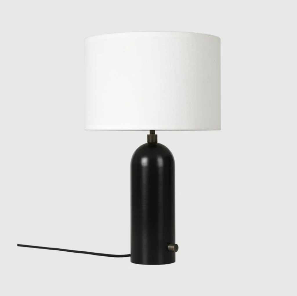 The Gravity table lamp aesthetically contrasts strength and fragility. Taking its name from the lamp’s distinctive balance between the anchoring of the heavy, cylindrical base and the lightweight, airy shade, it beautifully merges into a sculptural whole.