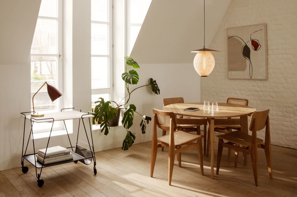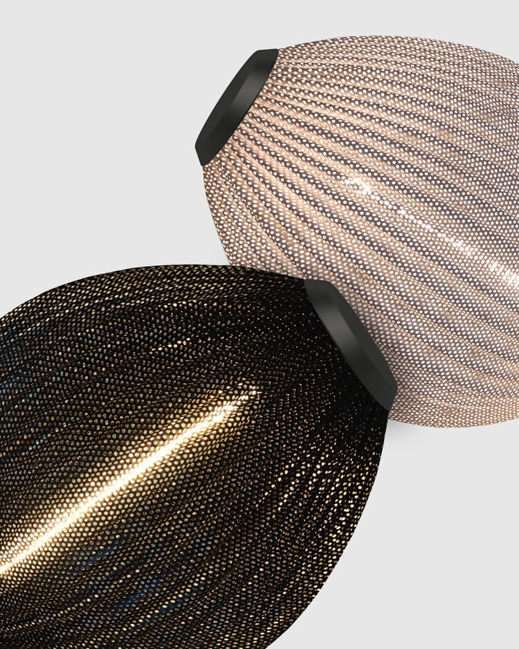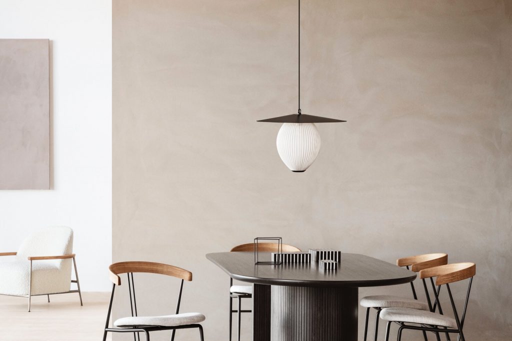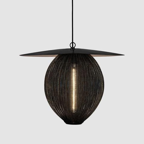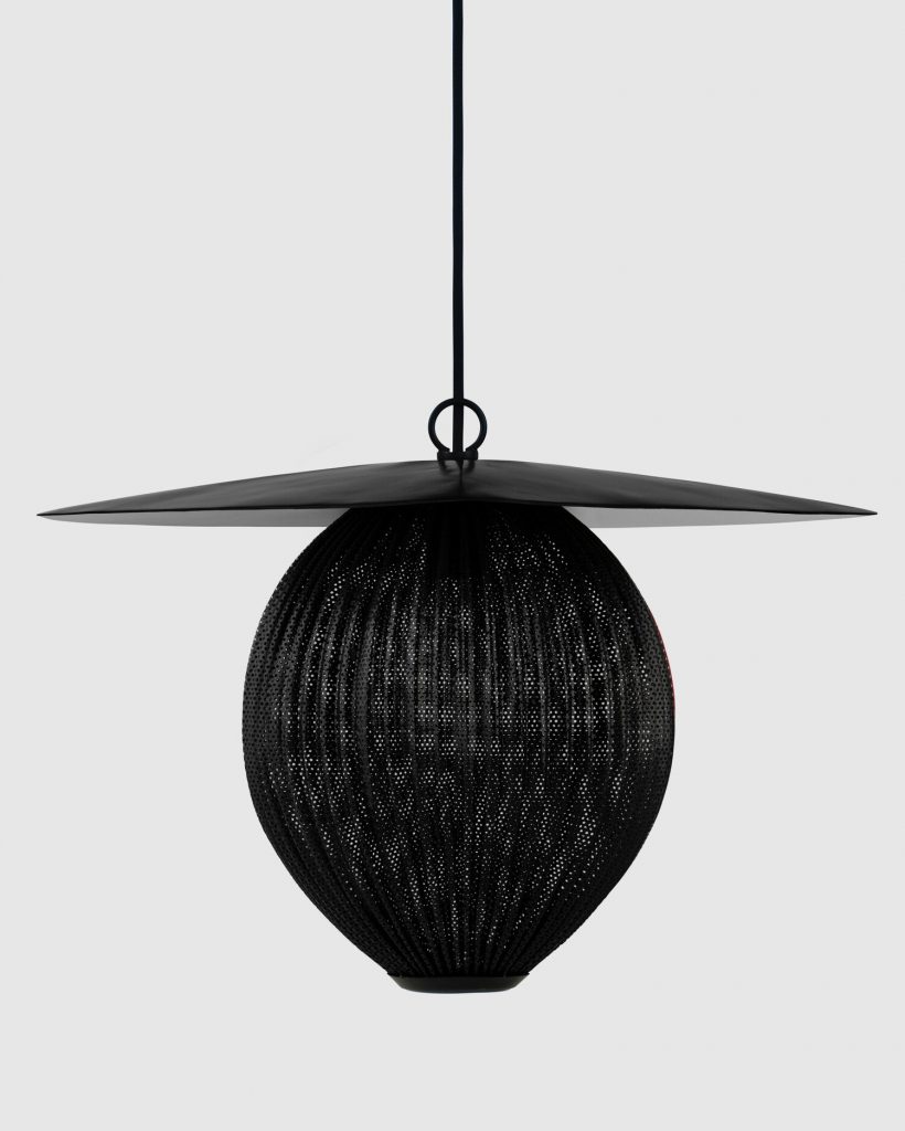 The Satellite Pendant was designed by Mathieu Matégot in 1953 with geometrical shapes and an organic shade to create outstanding sculptural aesthetics.