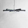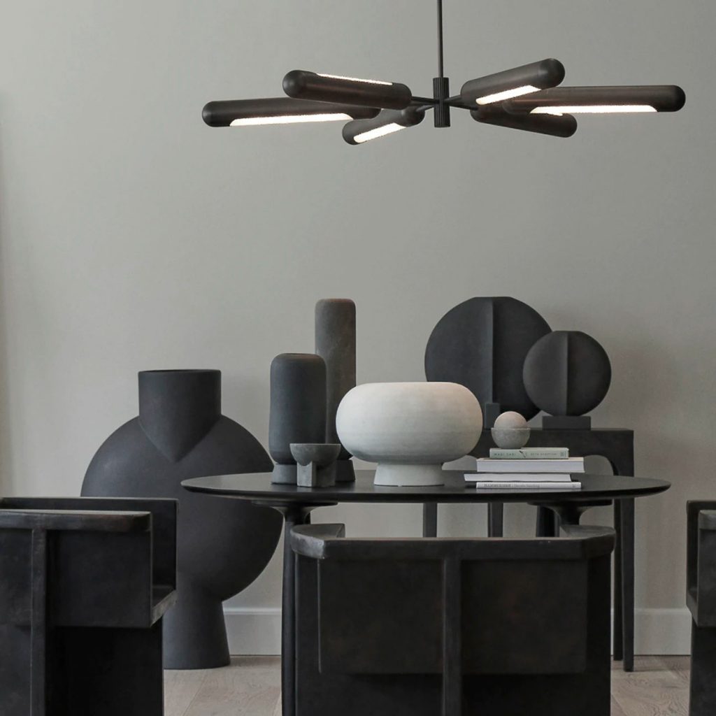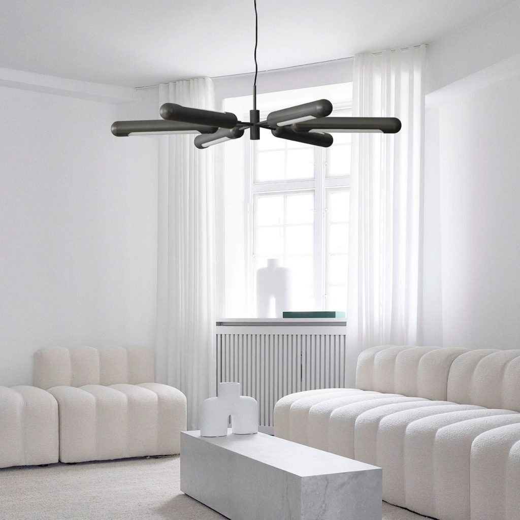 The Bullet Chandelier is characterised by a closed tubular metal lampshade with a smooth carved opening. The opening is covered in a curved piece of opal glass, filtering the light from the light source inside.