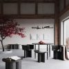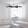 The chandelier has six adjustable arms positioned in a flexible hexagon setting and mounted on a rifled centrepiece, adding a shimmering and reflective quality to the lamp. Two of the chandelier arms are turned upwards to ensure lighting towards the ceiling, while the other lampshades are facing downwards to brighten up the space below the chandelier.