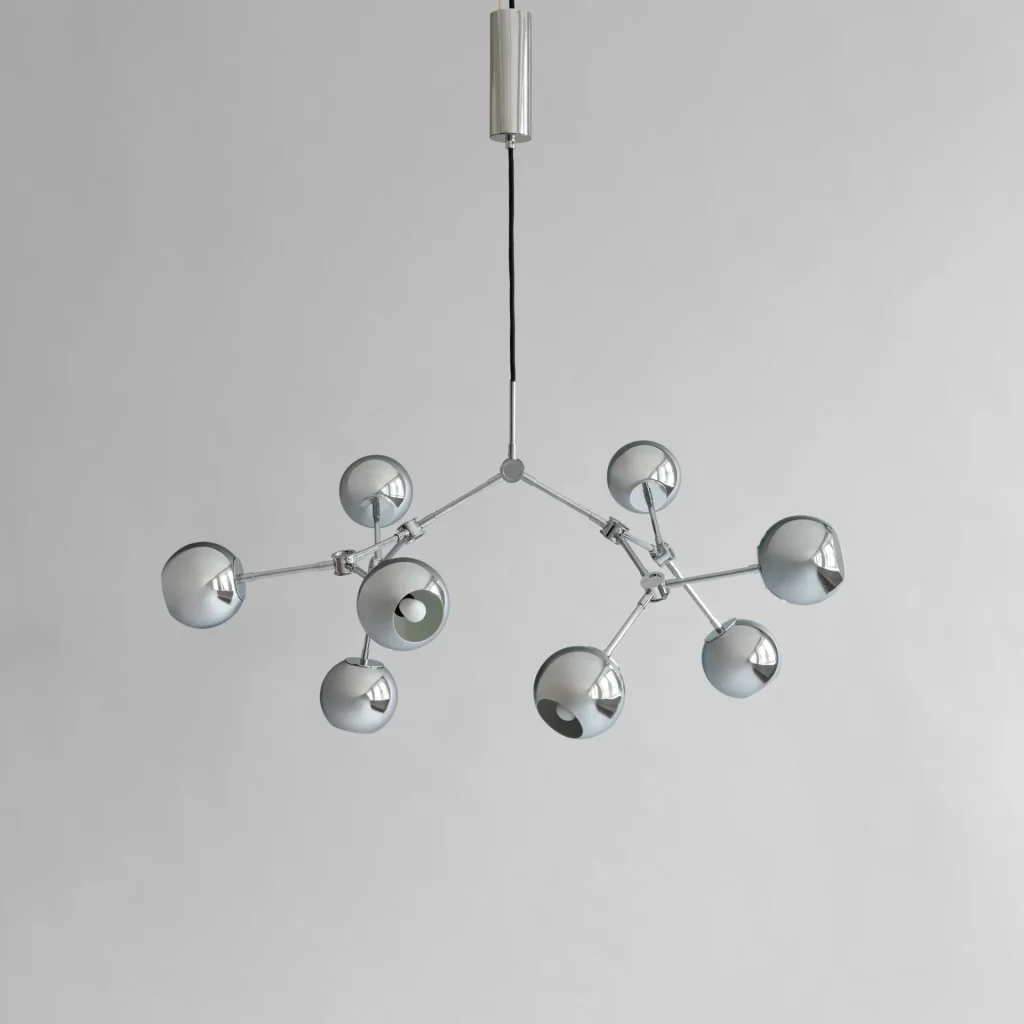The Drop Chandelier Globe introduces a captivating twist to its iconic design with the introduction of a sleek, globe-shaped metal lampshade. Named after its lampshade, Drop Chandelier Globe is an ode to 80’s geometric designs, emphasizing clean lines and effortlessly melds with any interior decor.
