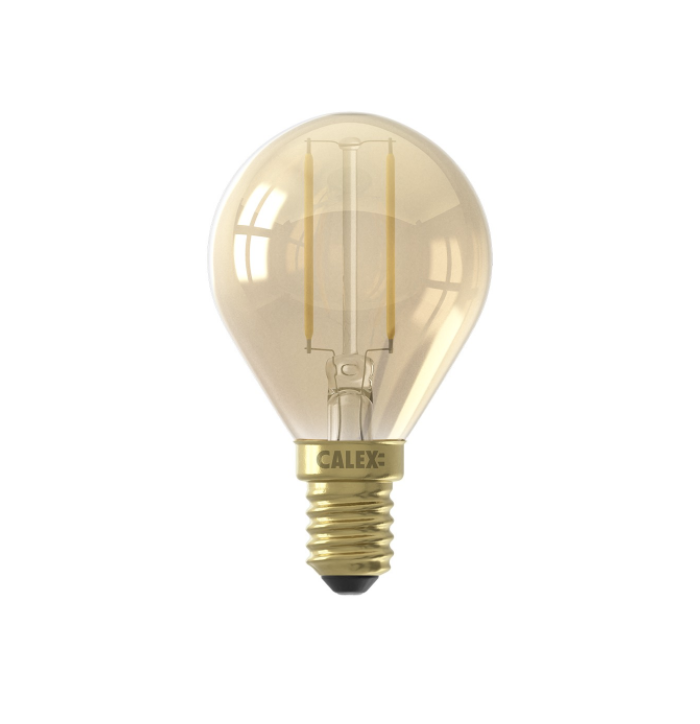 Calex LED Full Glass Filament Ball Lamp 220-240V 2W 130lm E14 P45, Gold 2100K. Lifetime 15,000hrs.