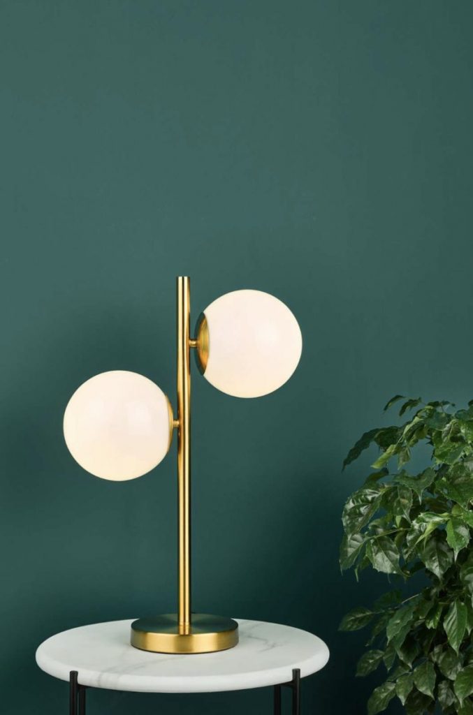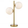 Two oversized opal globes are positioned unequally on a vertical stem and simple cylindrical base. Fitted with a black braided cable and in-line rocker switch.
