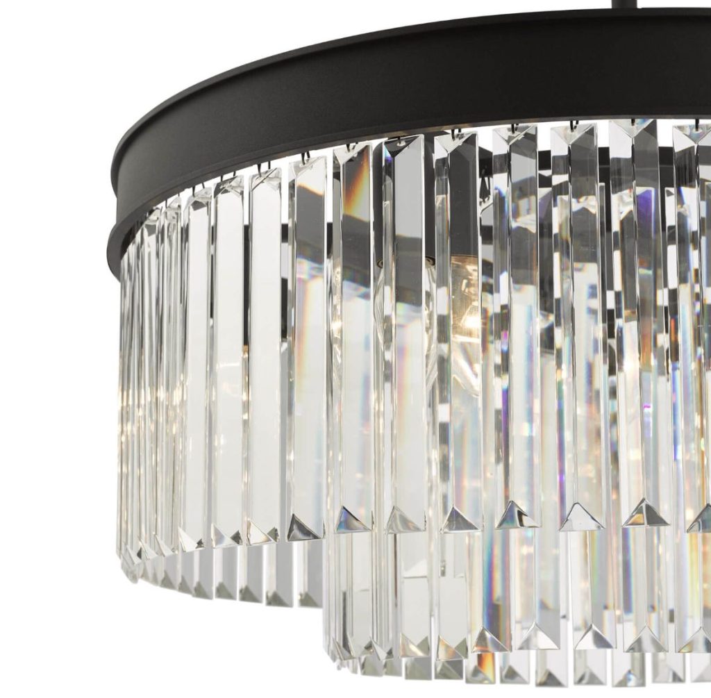 The Celeus 6 light 60cm chandelier is a stunning statement chandelier combining clear faceted crystal with a contrasting textured anthracite finish. Our designers have concentrated on keeping this fitting looking elegant and sophisticated. Special attention was made to obscure the crystal fittings with the anthracite frame. The 60cm chandelier makes a perfect statement light in most living and dining rooms, especially where black accents such as Crittal doors are used.