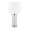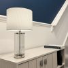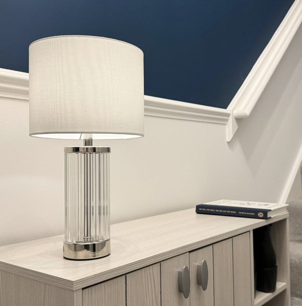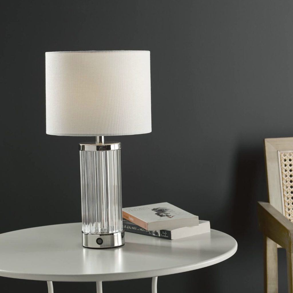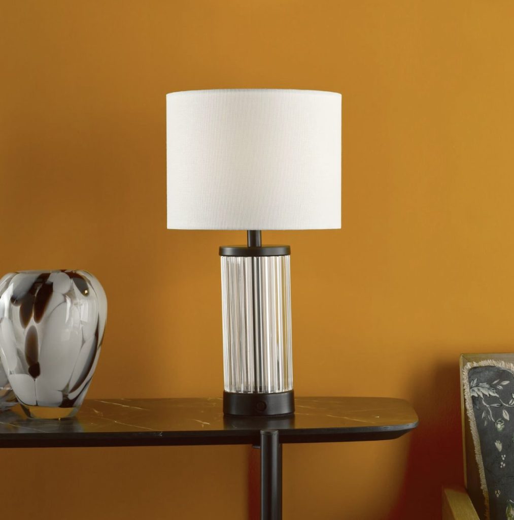 The sleek satin black or nickel finish and ribbed glass base create a stylish and timeless look that makes it a perfect addition to various decor schemes. The addition of a white linen shade provides a soft and subtle contrast, which complements the overall design beautifully.