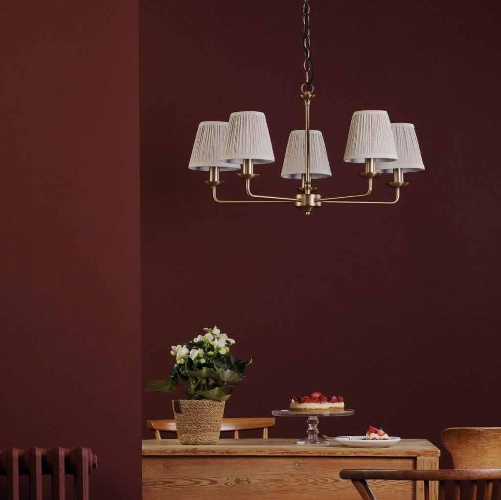 The Favian 5 light pendant offers two distinctive looks in one versatile design. Its warm matt bronze frame can be styled without shades for a heritage farmhouse feel, or paired with fabric shades to add cosy cottage charm, a Victorian edge, or a pop of colour to suit your scheme.
