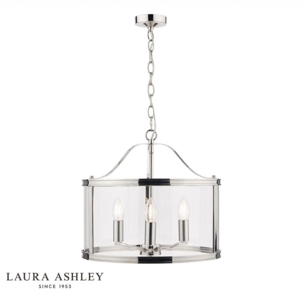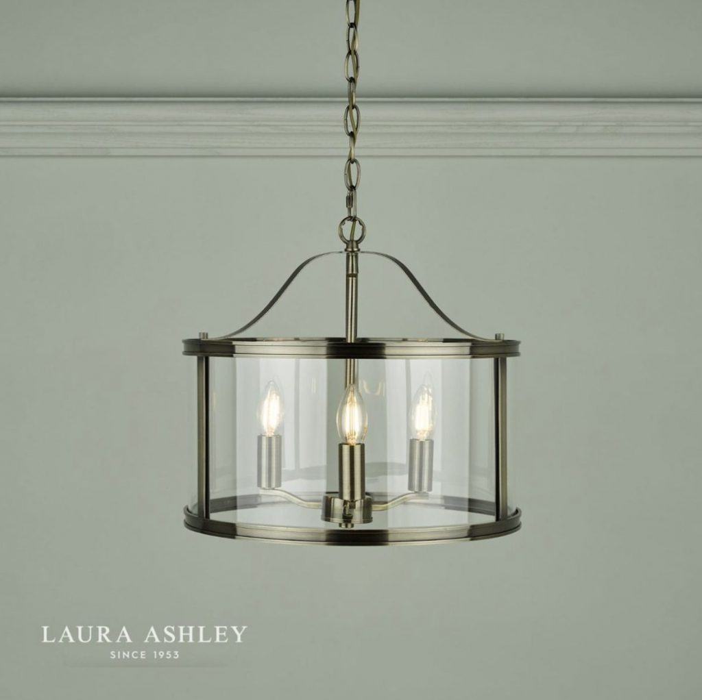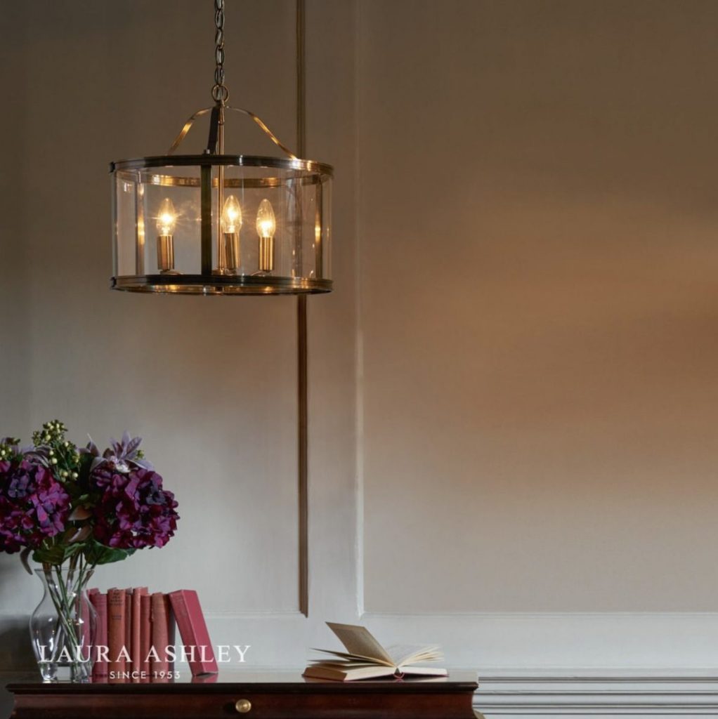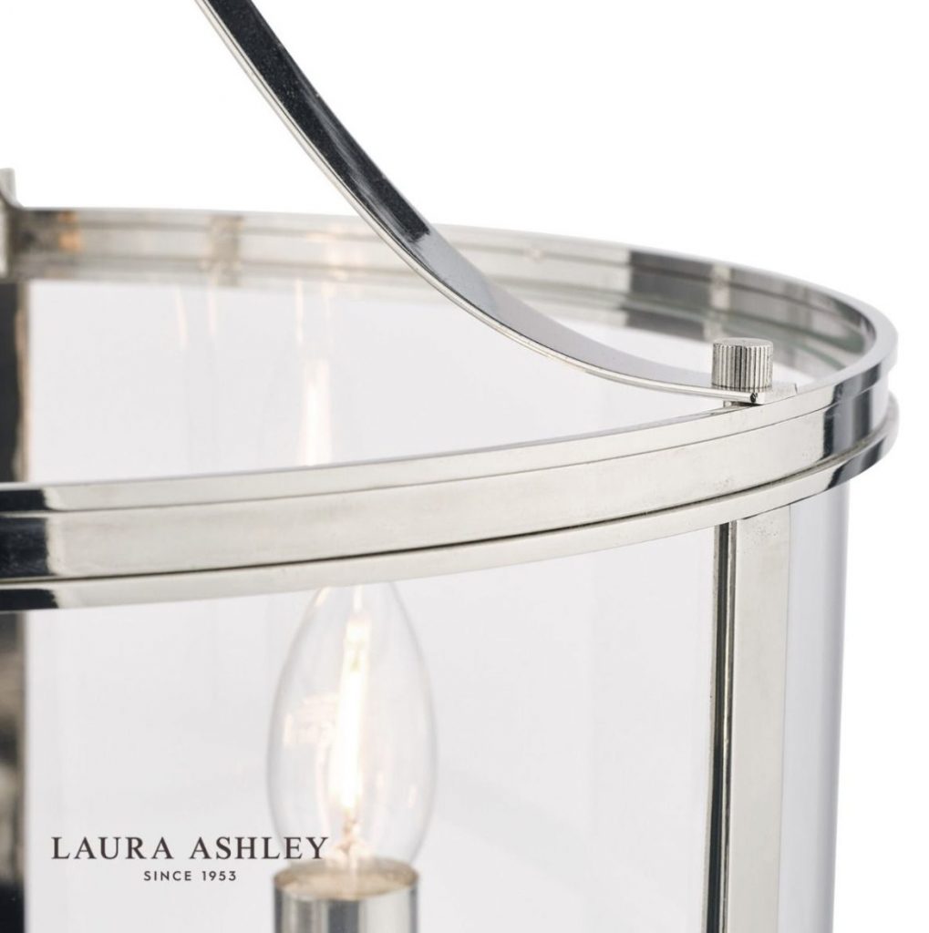 The clean-lined Laura Ashley Harrington ceiling pendant light is a graceful blend of clear glass and sleek metal. A simple, lantern-style drum-shaped case surrounds a suspended trio of lampholders, all in a vintage polished nickel or antique brass finish for effortlessly elegant looks.