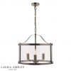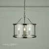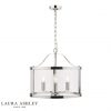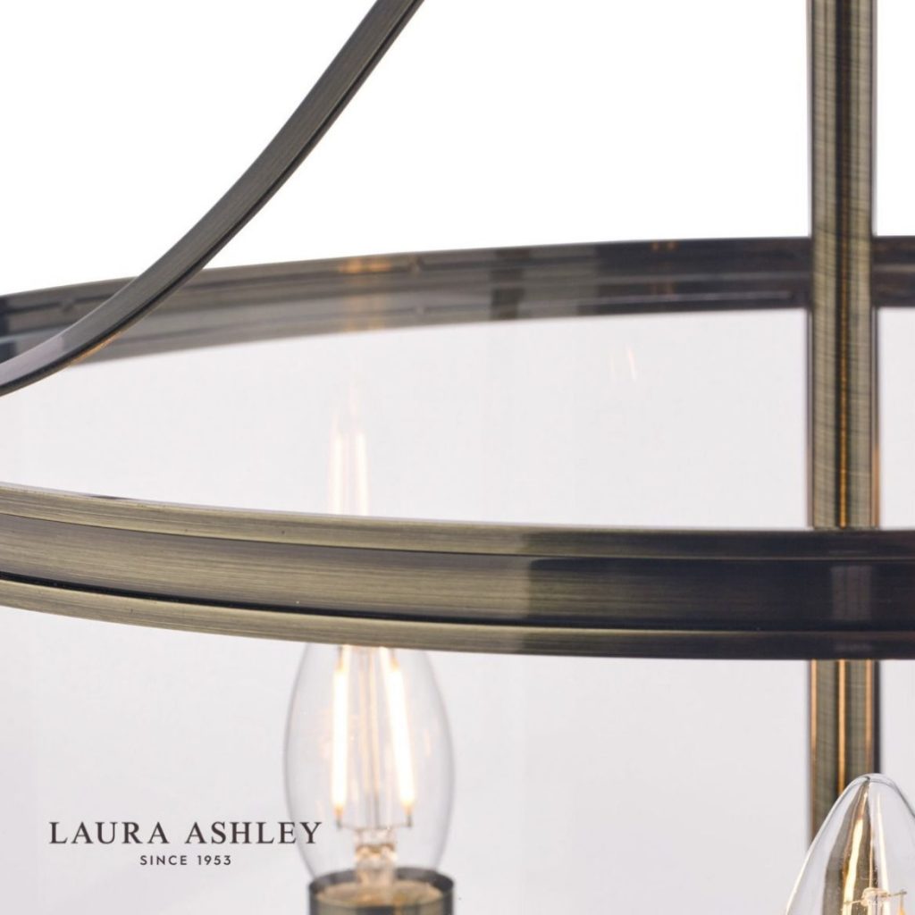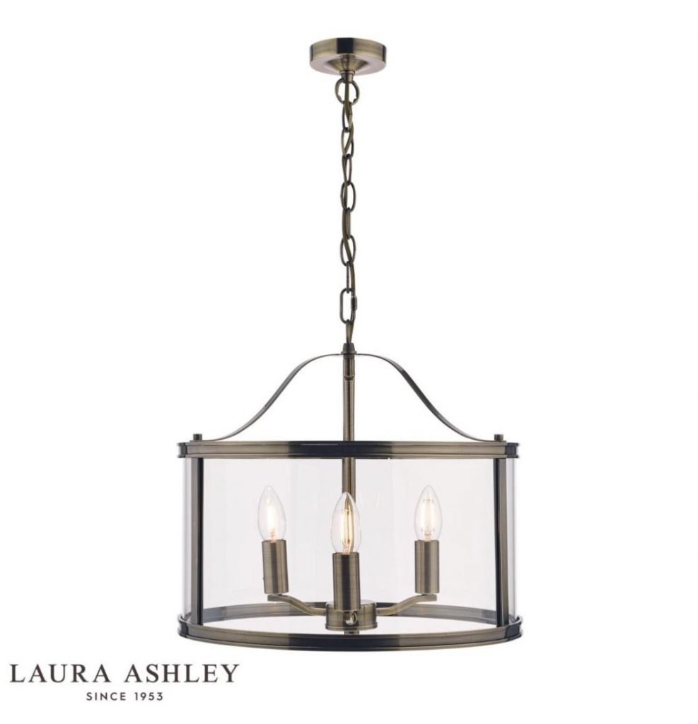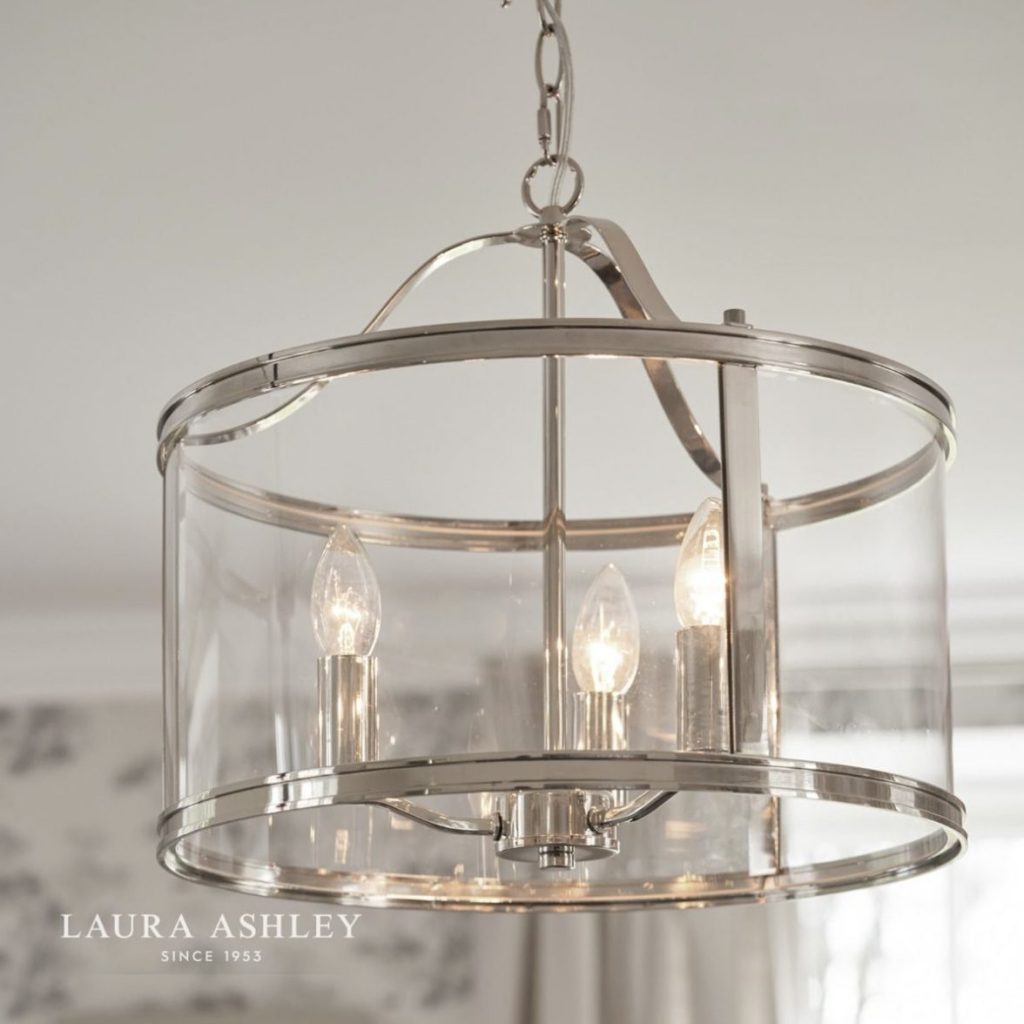 The clean-lined Laura Ashley Harrington ceiling pendant light is a graceful blend of clear glass and sleek metal. A simple, lantern-style drum-shaped case surrounds a suspended trio of lampholders, all in a vintage polished nickel or antique brass finish for effortlessly elegant looks.