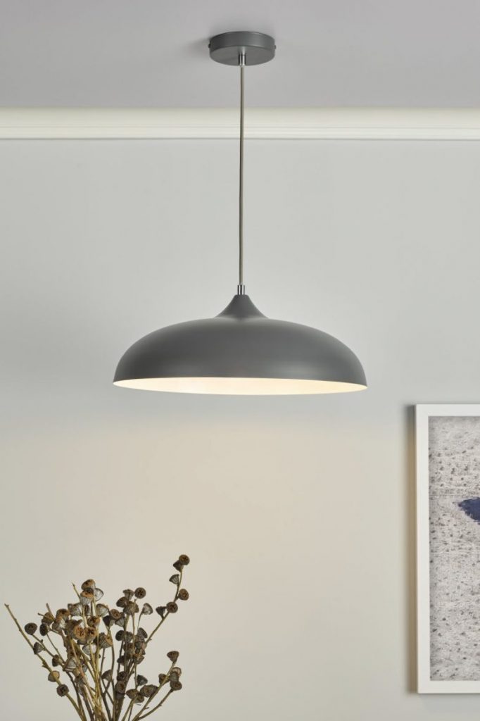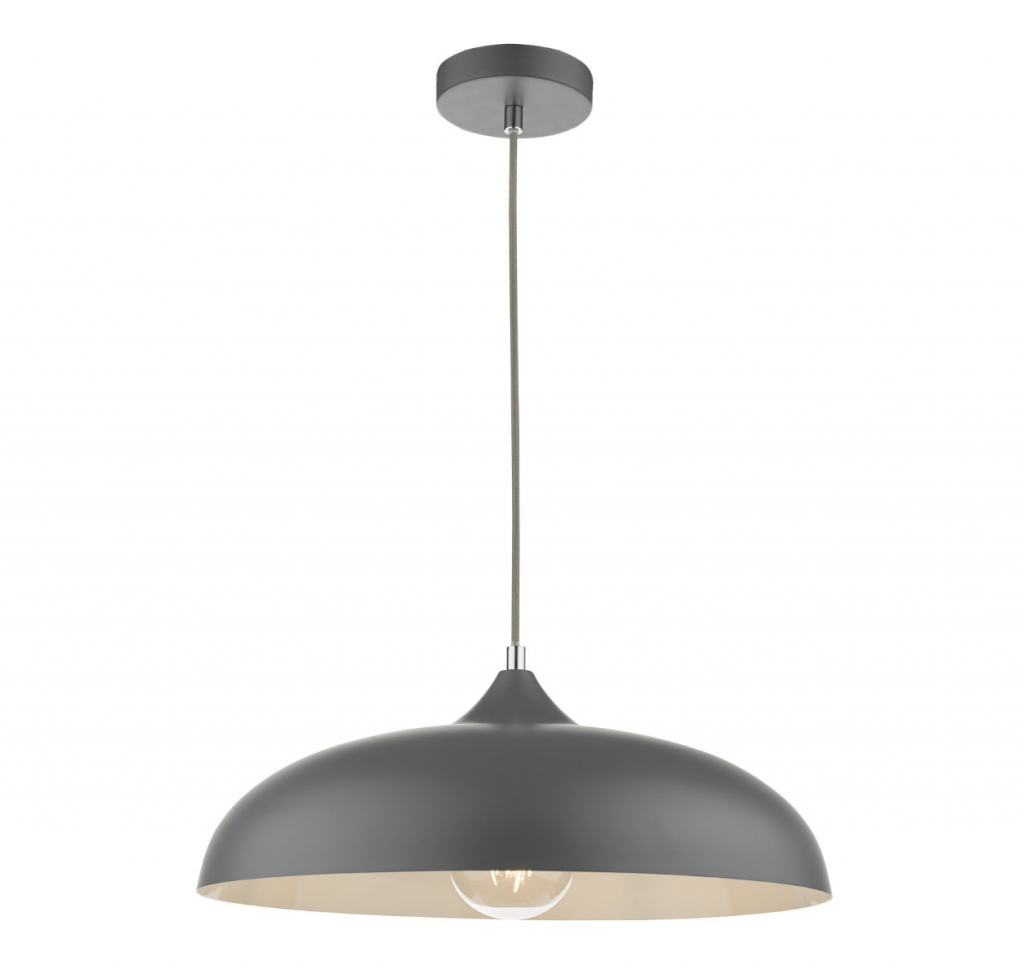 The Kaelan single pendant has a subtle and elegant curved dome finished in a modern matt mid-grey with small polished chrome details.