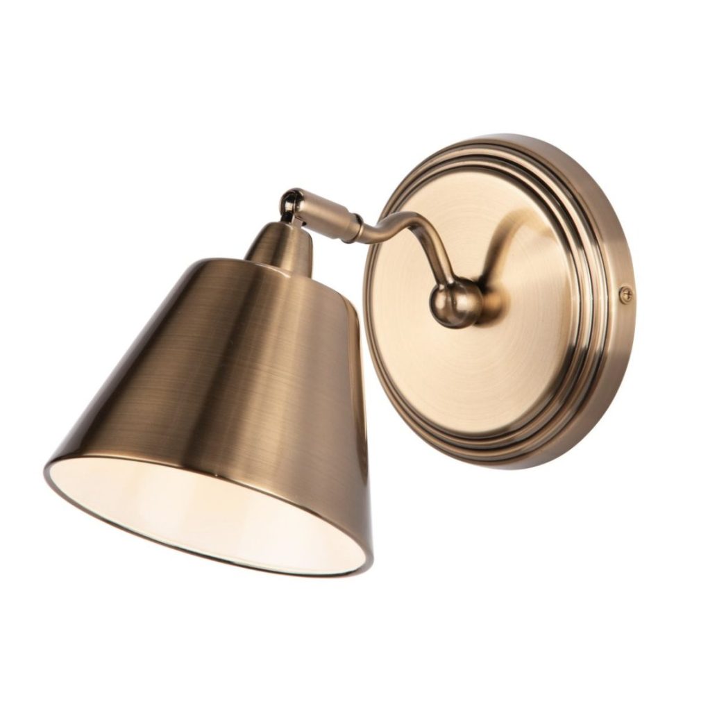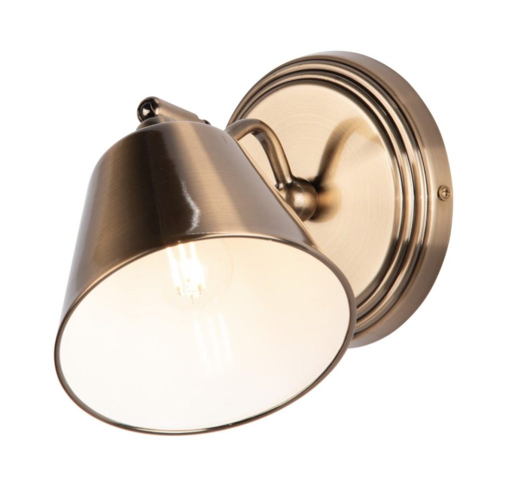 The KEMPTEN is a traditional metal shaded wall lamp in a convincing antique brass finish with an adjustable head.