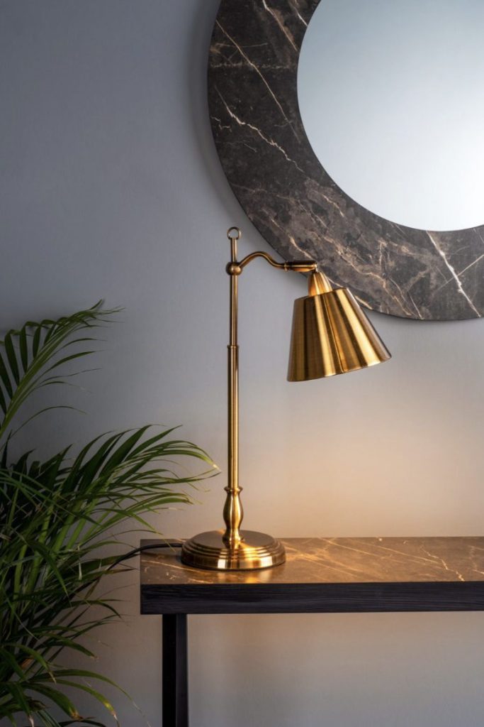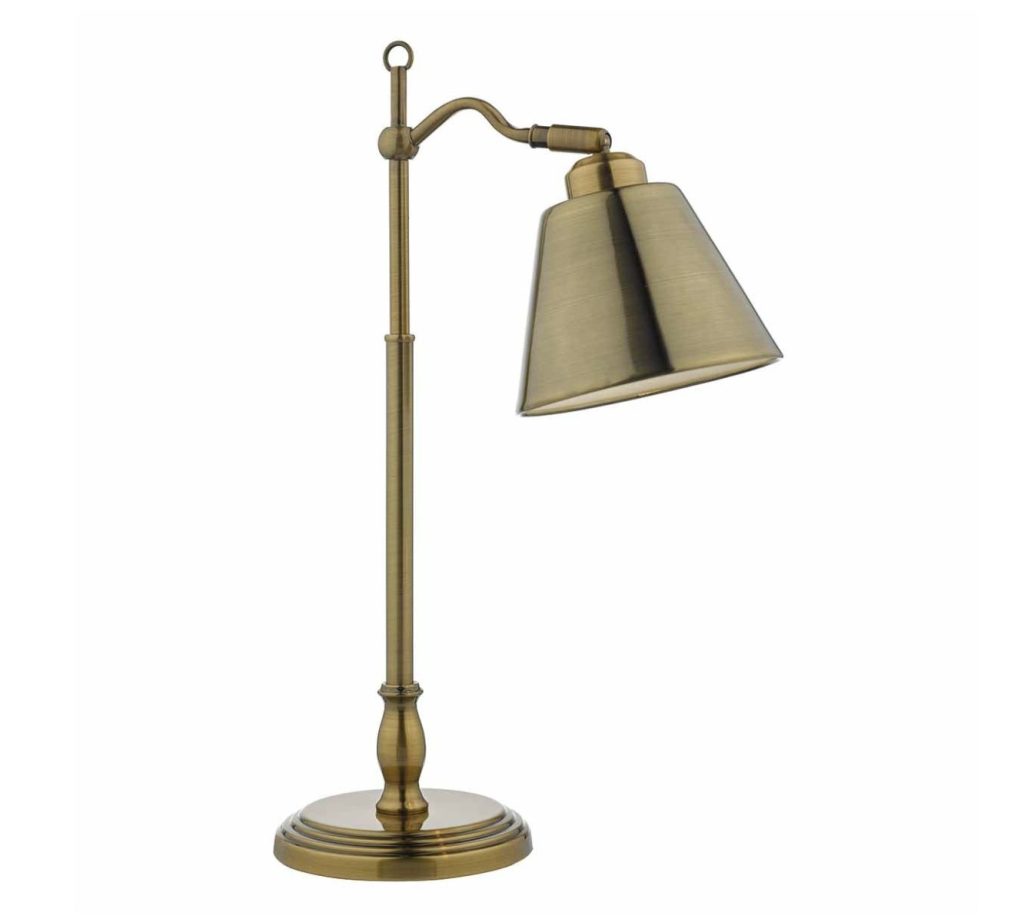 The KEMPTEN is a traditional metal shaded table lamp in a convincing antique brass finish with an adjustable head; operated with an inline rocker switch.
