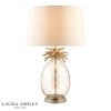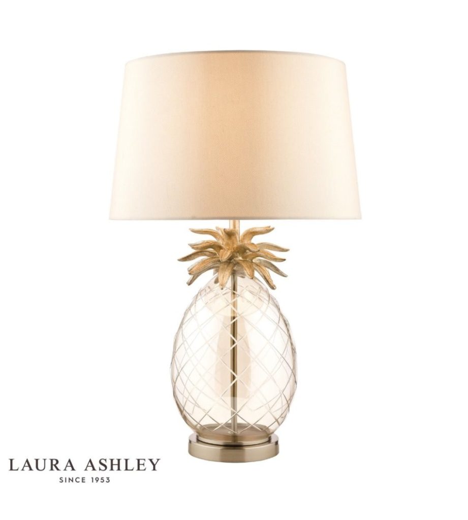 Create quirky home style with the small Laura Ashley Pineapple table lamp, and give your room some real character. The base is a pineapple shape, formed from champagne tinted, hand cut glass, and it is topped with resin pineapple leaves and tailed with a flat ring, both painted by hand in champagne gold. Paired with a glamorous taupe faux silk tapered drum shade.