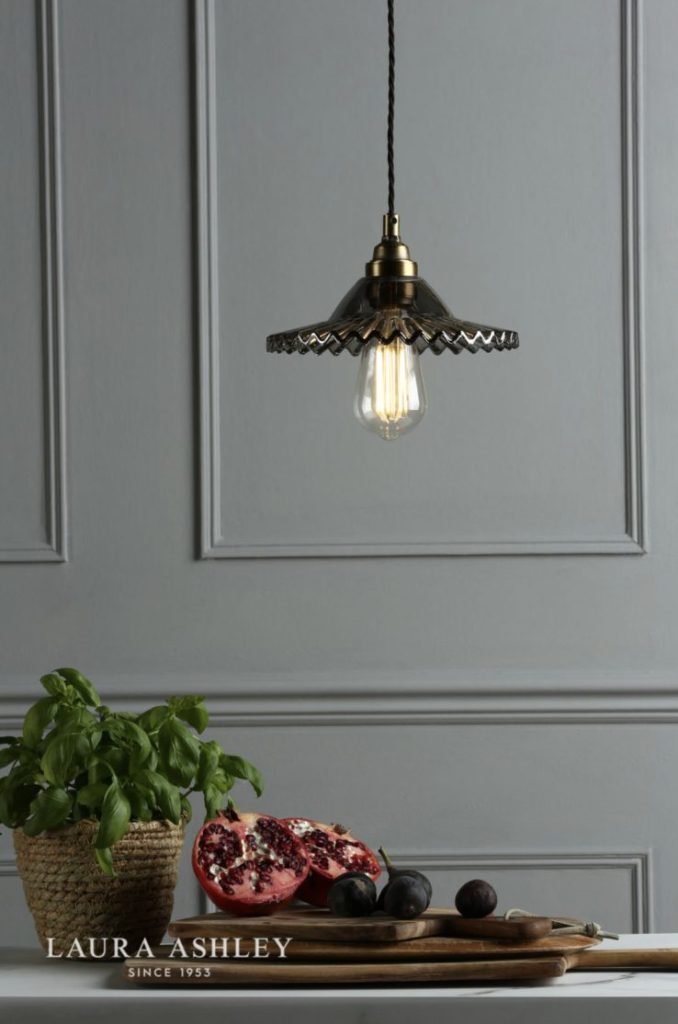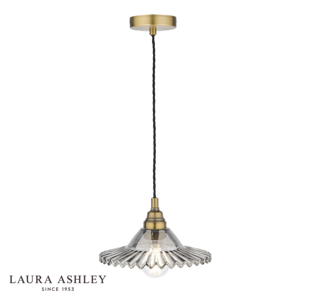 Reminiscent of the undulations on a clam shell or pie crust, the Pippa is in smoked glass and is teamed with fittings in aged brass and a matching flat round ceiling rose.