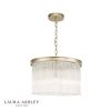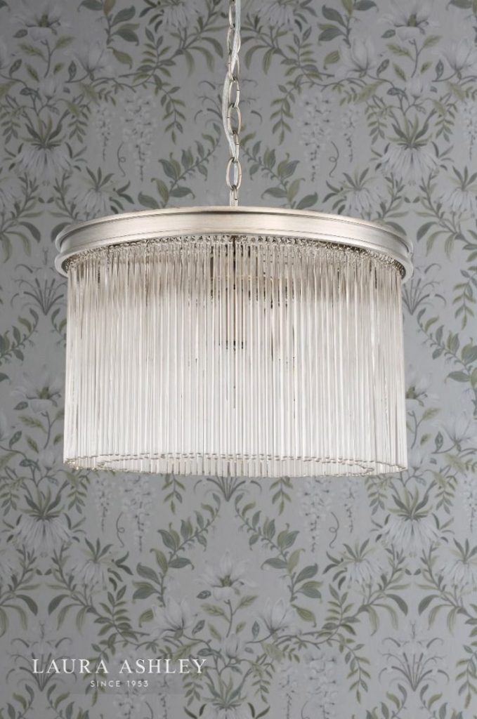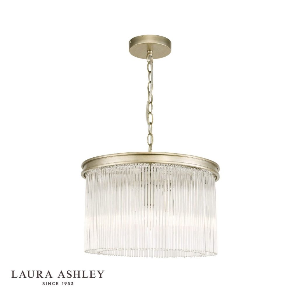 The elegant Manon ceiling light from iconic brand Laura Ashley is a stunning contemporary interpretation of the chandelier. Slender rods of clear crystal glass hang in double circles from metal rings. With its sophisticated champagne finish, painted by hand, this pendant light is the perfect centrepiece for a living room, dining room or bedroom.