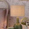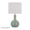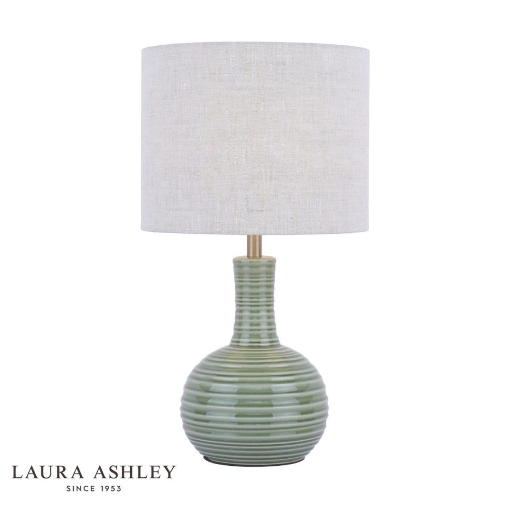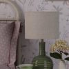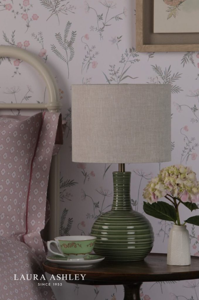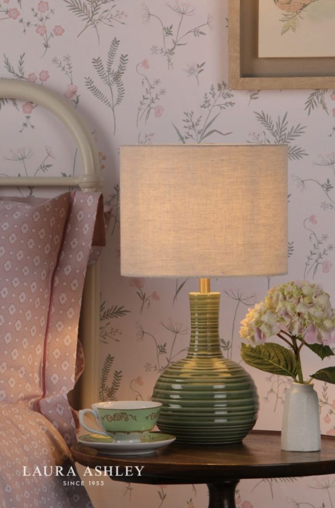 The Padley Table Lamp by Laura Ashley features a rippled ceramic base in a glossy transparent glaze in deep green. Paired with an oatmeal fabric lampshade that creates a warm glow of light, so you can set up the perfect ambience in your space.