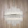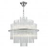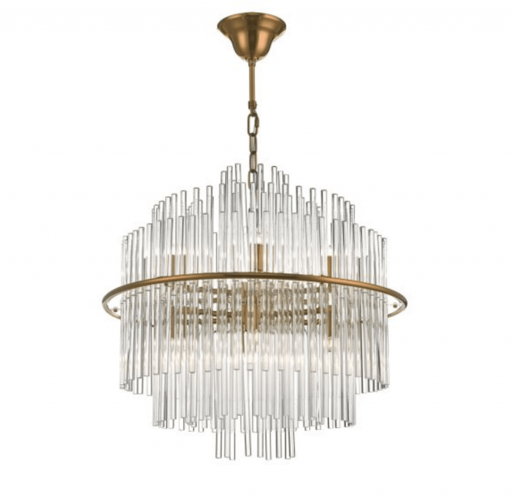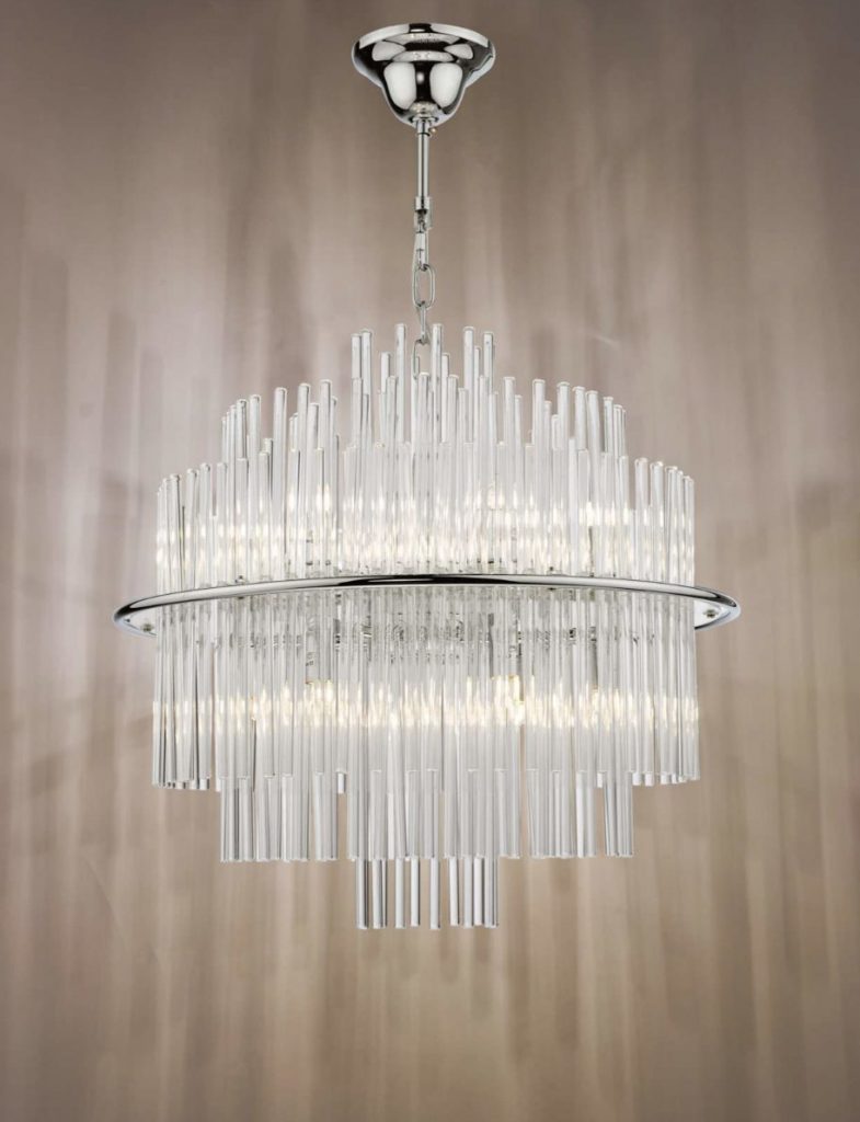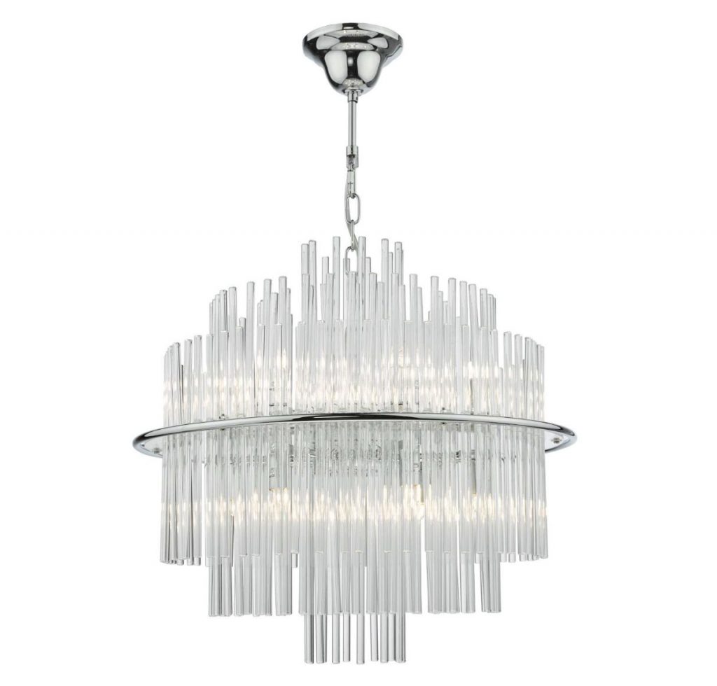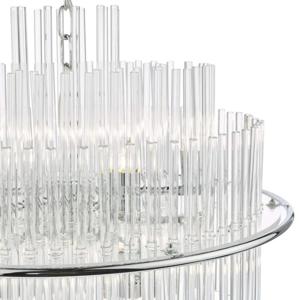 The Lukas 13 light Pendant in Antique Gold or Polished Chrome consists of hundreds of tiered glass rods appearing to give a floating illusion inside an antique gold or polished chrome band. This fitting is height adjustable and would make the perfect statement piece for any living area.