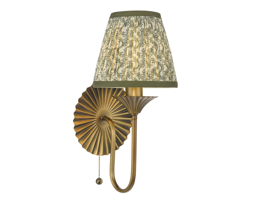 The Lydian Wall Light combines traditional charm with versatile farmhouse style in a compact design. Finished in warm antique bronze with a decorative starburst backplate, it comes complete with a green cotton shade that adds a fresh accent while softly diffusing the light.