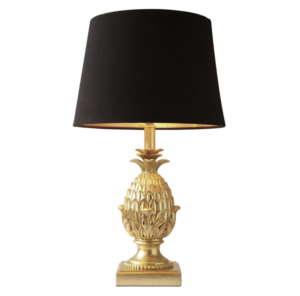 The PINEAPPLE Table Lamp features an ornate hand cast gold resin pineapple base and comes complete with a black satin tapered drum shade, with gold lining.