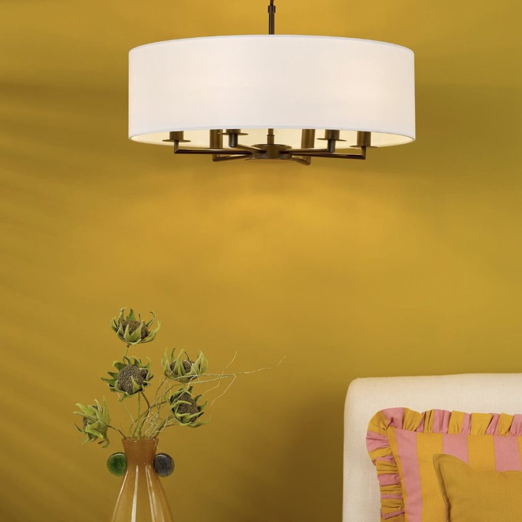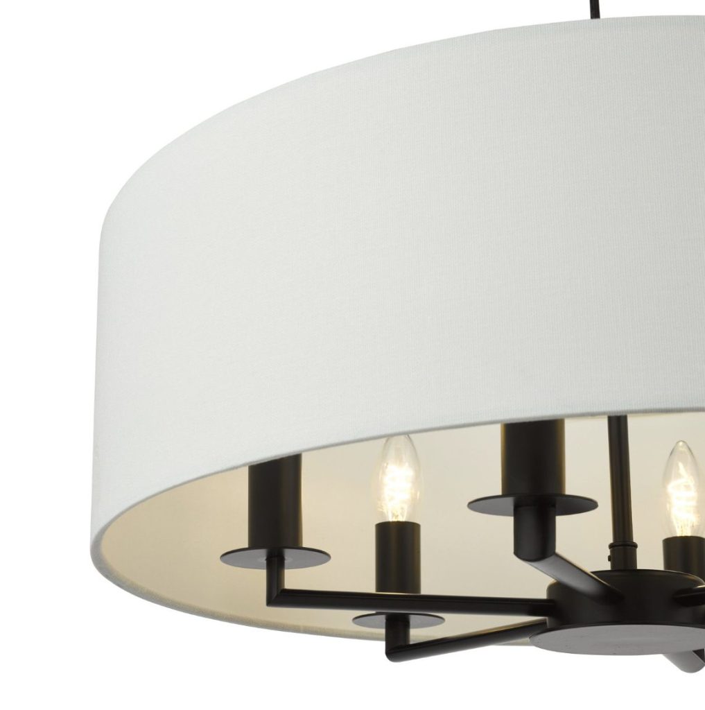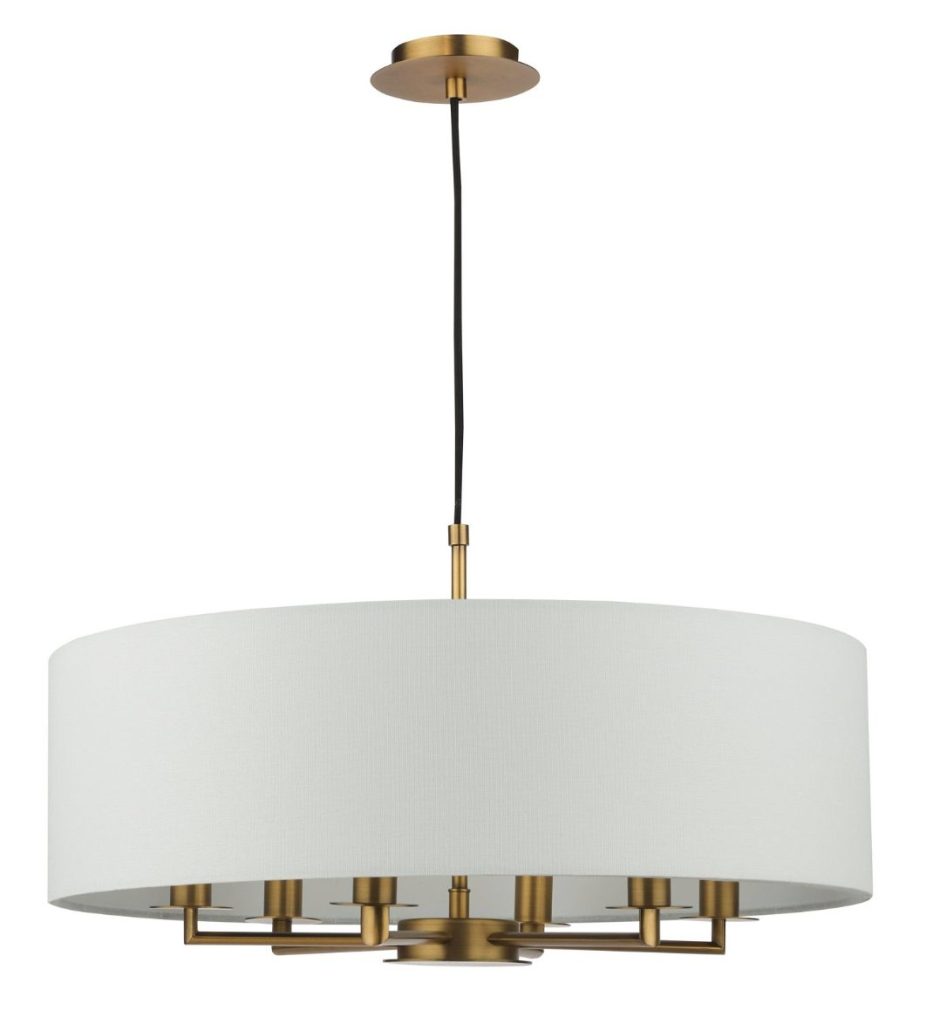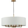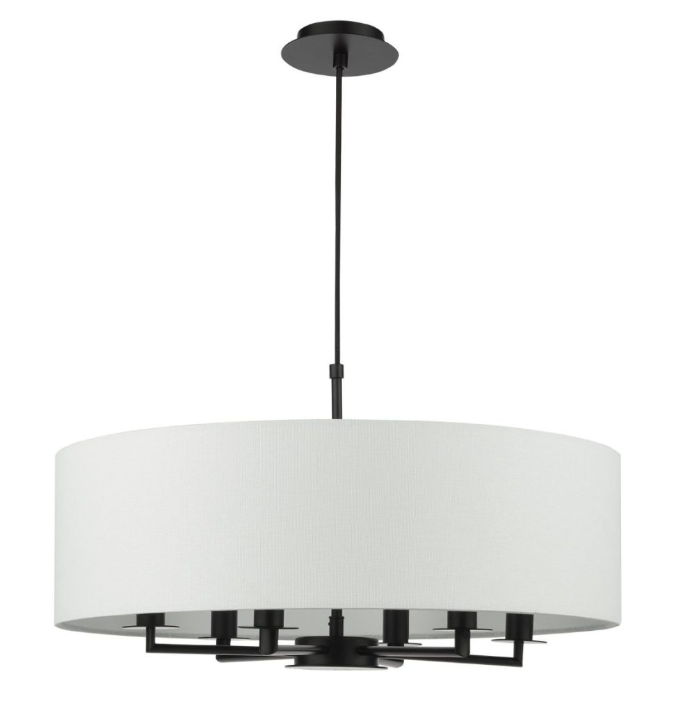 The Tyler 6 light pendant blends contemporary elegance with versatile design, featuring a crisp ivory linen shade with matching lining and a refined oval arm profile.