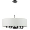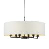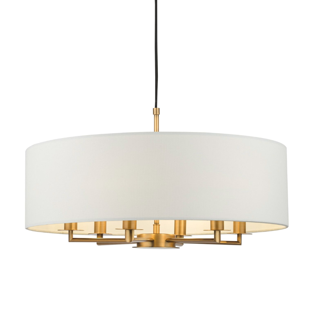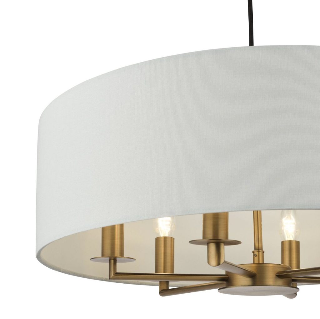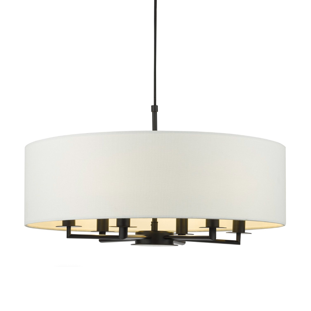 The Tyler 6 light pendant blends contemporary elegance with versatile design, featuring a crisp ivory linen shade with matching lining and a refined oval arm profile.