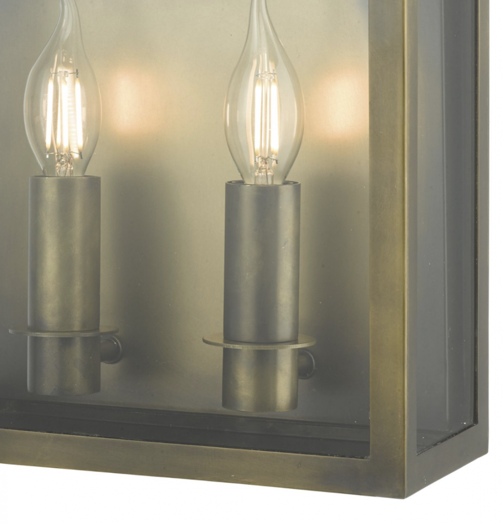 The VAPOUR 2lt Wall Light is a contemporary take on a traditional coach lantern. IP44 rated, with water resistance suitable for outdoor use. Matt Black or Weathered Brass finish.