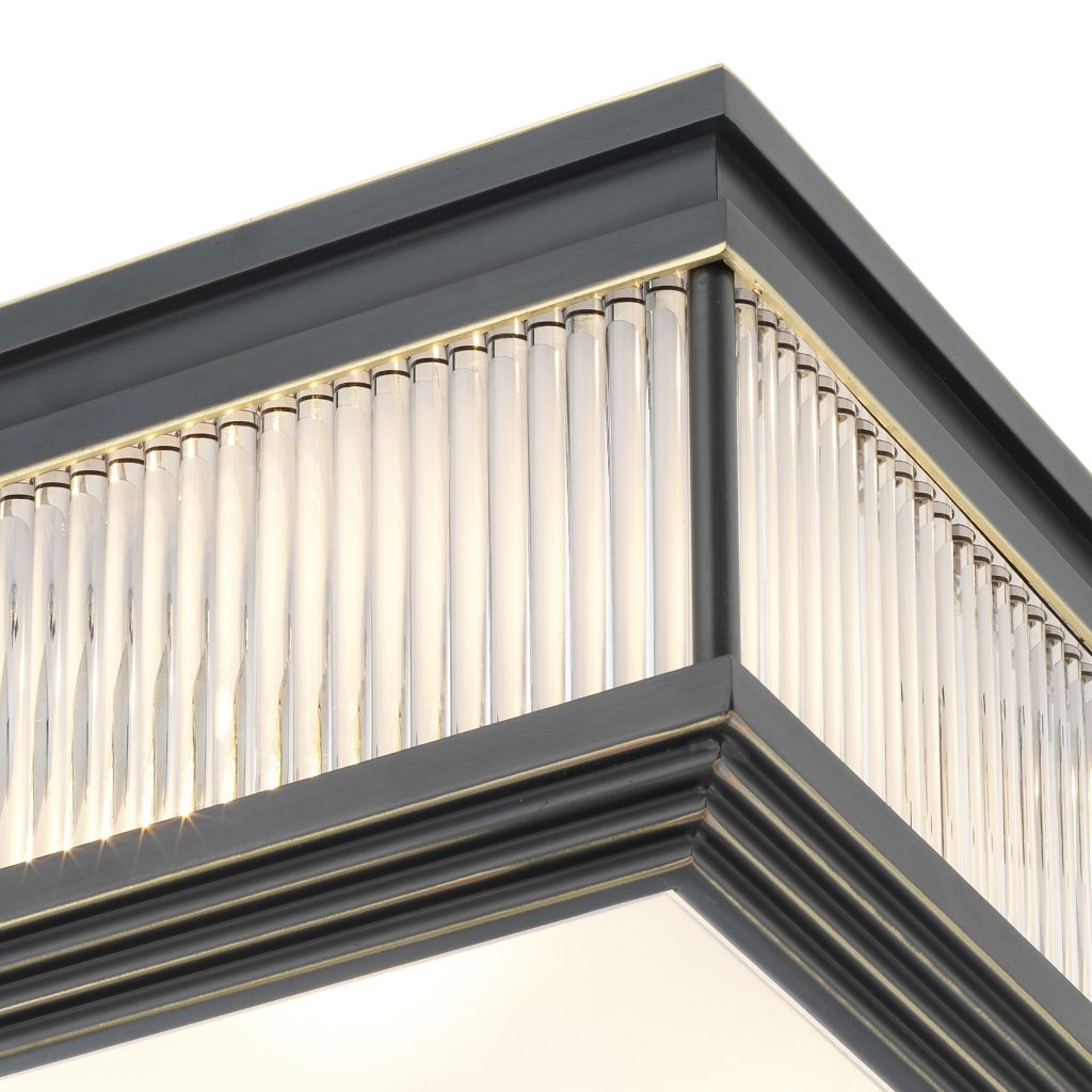 Light up your ceiling with the glamorous Marly Ceiling Lamp. Rods of clear glass are set in side panels of the square frame to create a sparkling effect. The frosted glass diffuser at the bottom hides all bulbs from view and eliminates any glare.