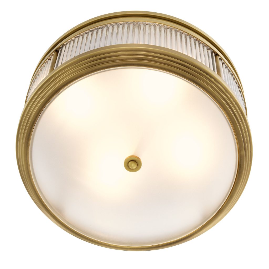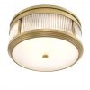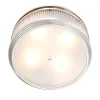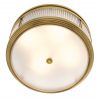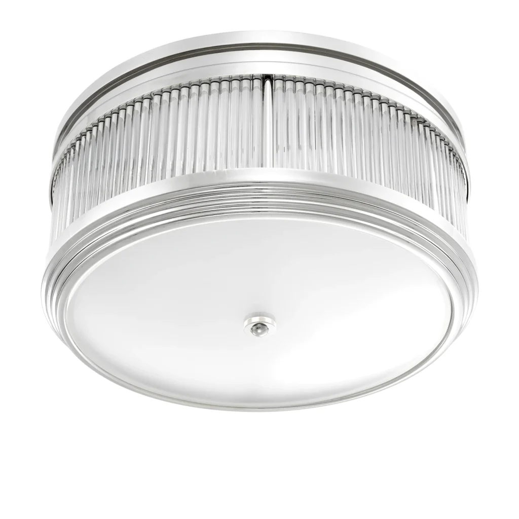 Rods of clear glass are set in the side panels of the circular drum frame to create a sparkling effect. The frosted glass diffuser at the bottom hides all bulbs from view and eliminates any glare. This flush mounted ceiling light has a nickel finish and is ideal for lower height ceilings.