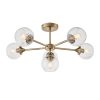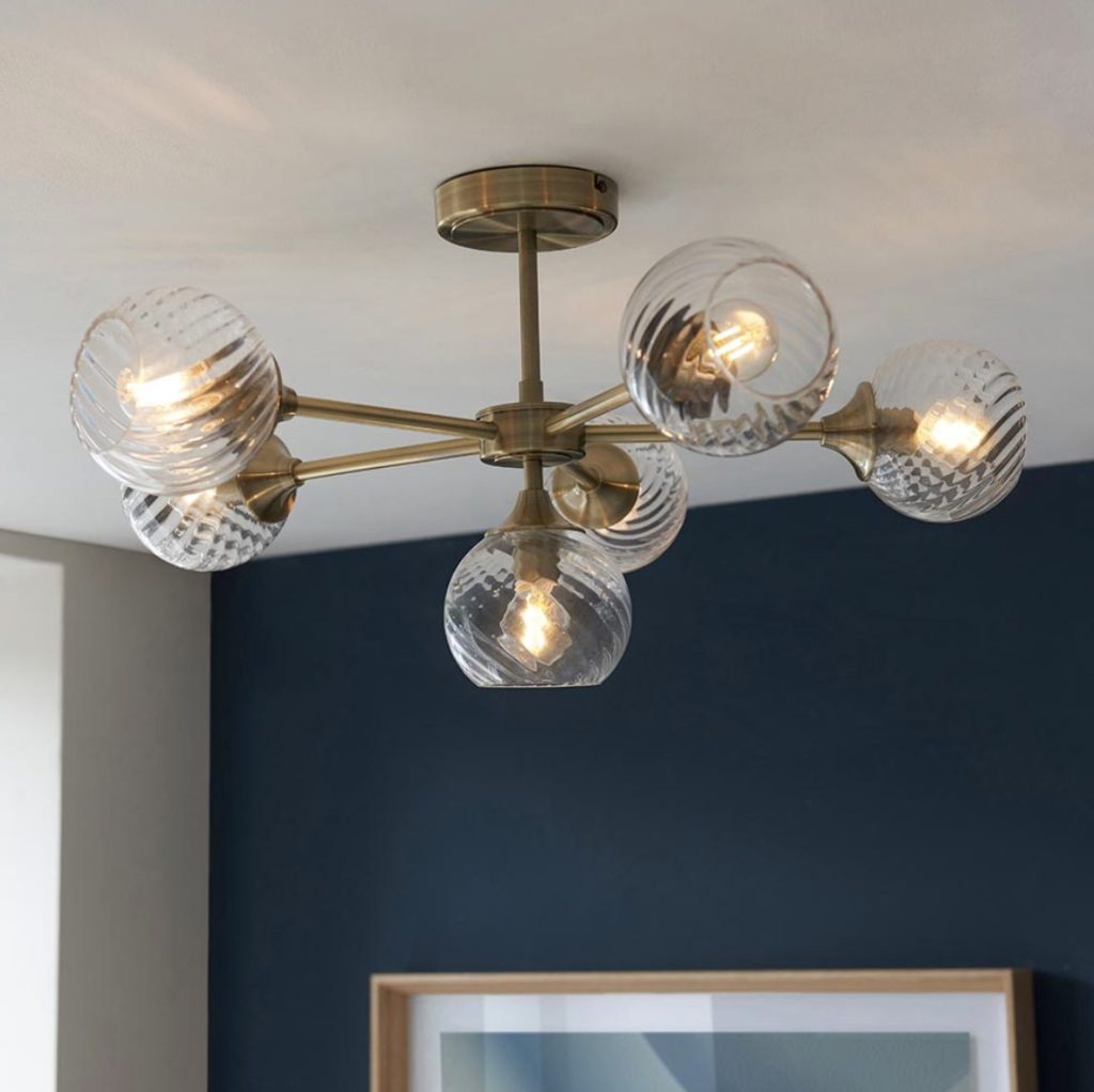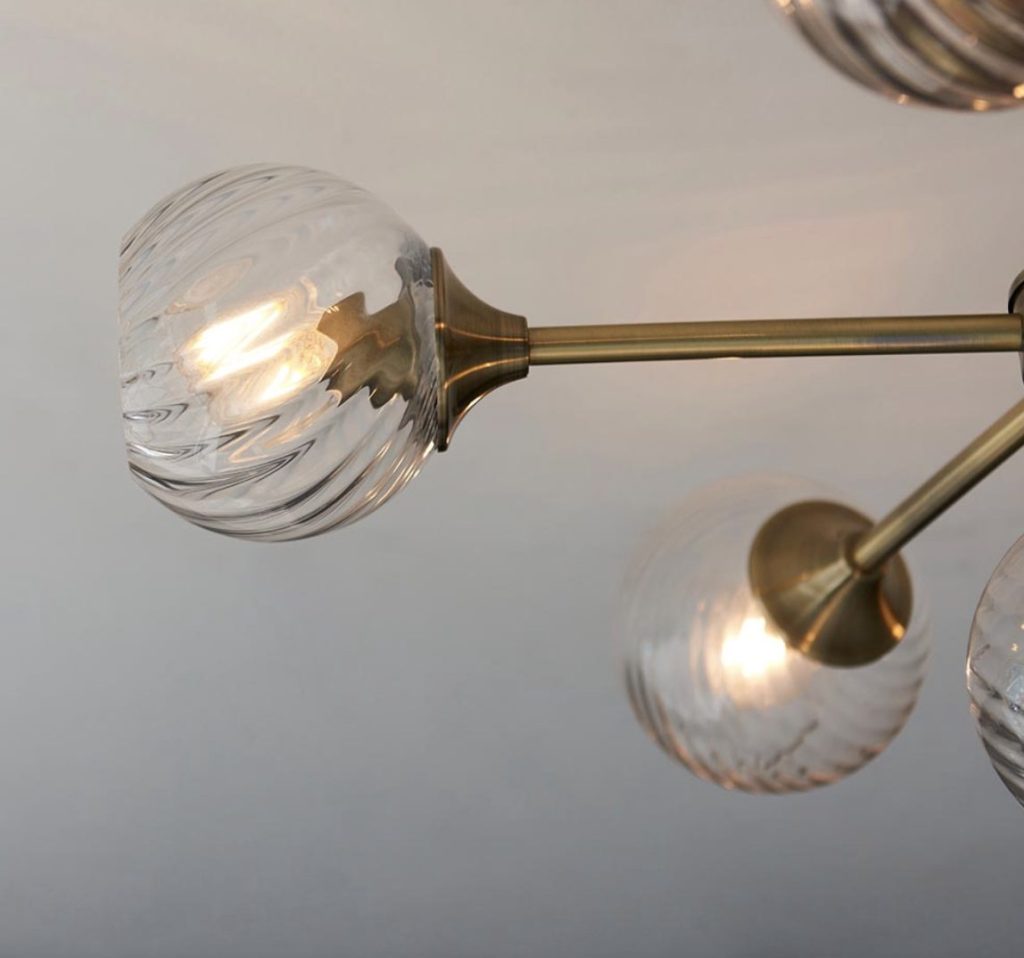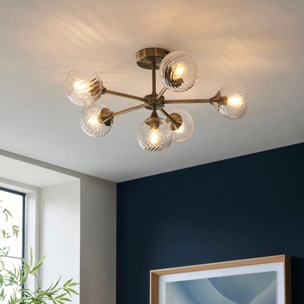 Twisted glass shades give this ceiling light a decorative edge. This 6 light semi flush is perfect for casting light around rooms with low ceilings, finished in a stunning antique brass plate.